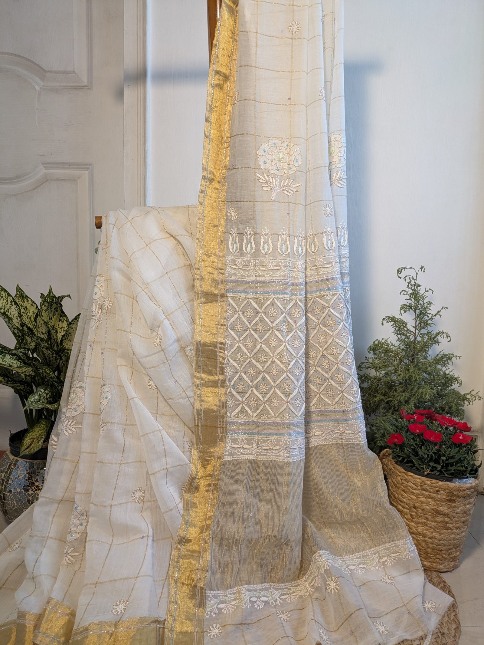 Drape yourself in elegance with our Mul Cotton Chikankari Saree, beautifully handcrafted with intricate sequins, cutdana, and moti work with zari work in pallu. The soft, breathable fabric ensures comfort, while the delicate embellishments add a touch of shimmer and sophistication. Perfect for festive and special occasions, this saree is a timeless blend of tradition and grace.