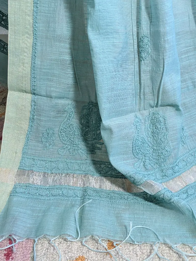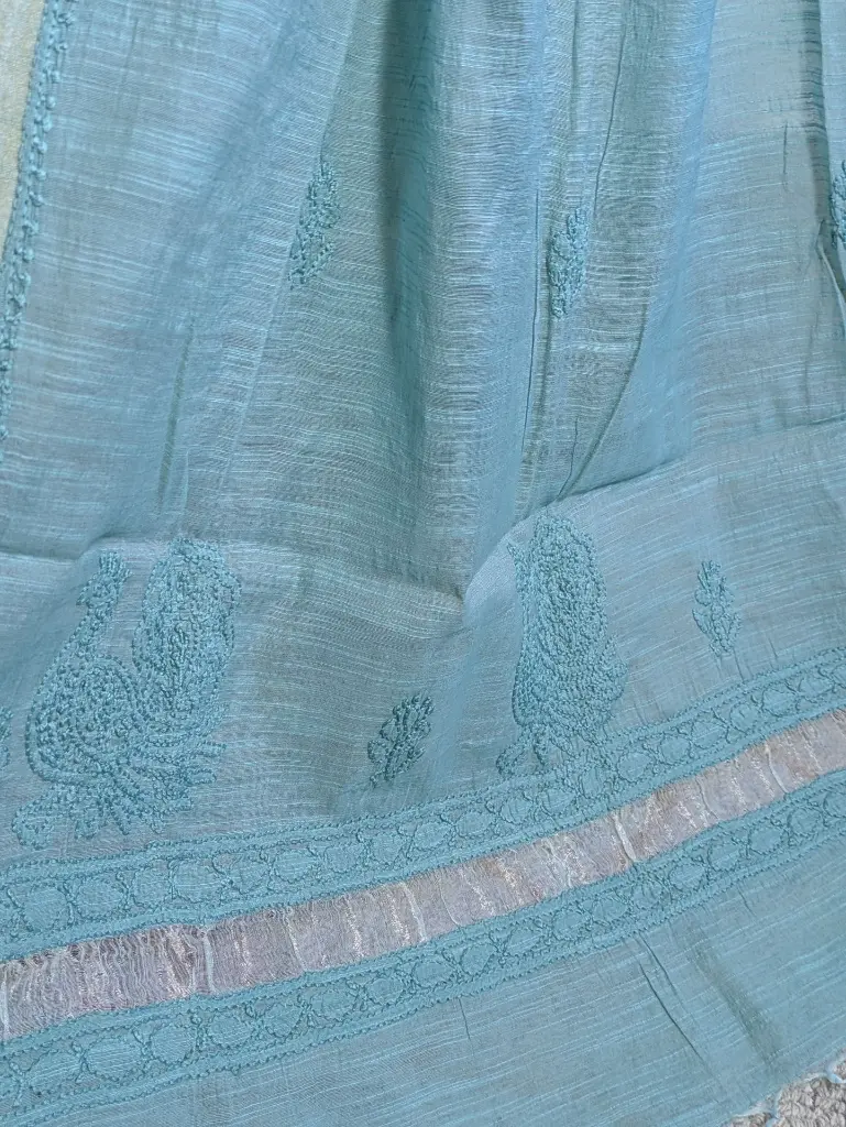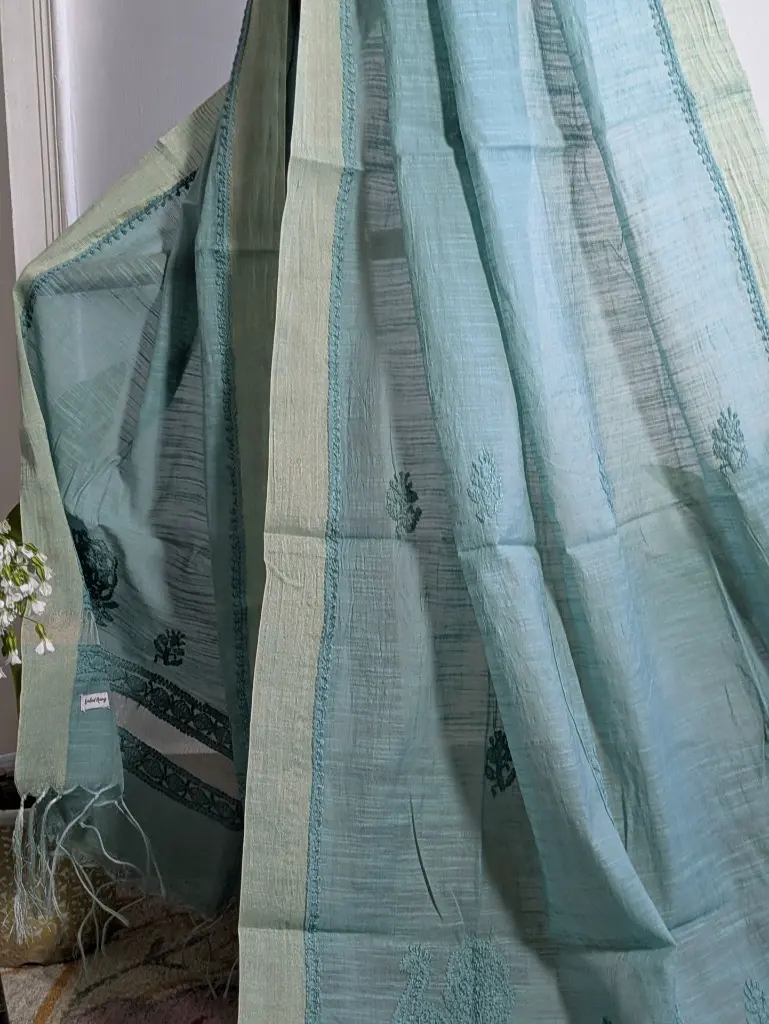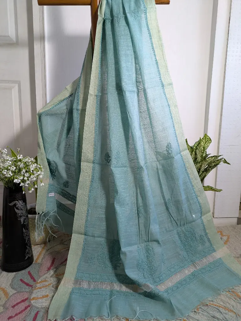 Enhance your look with this green Chanderi Chikankari dupatta, delicately handcrafted with intricate thread embroidery. The soft, lightweight fabric with its subtle sheen beautifully complements the timeless artistry, making it a perfect blend of tradition and elegance. A versatile addition to elevate any outfit.
