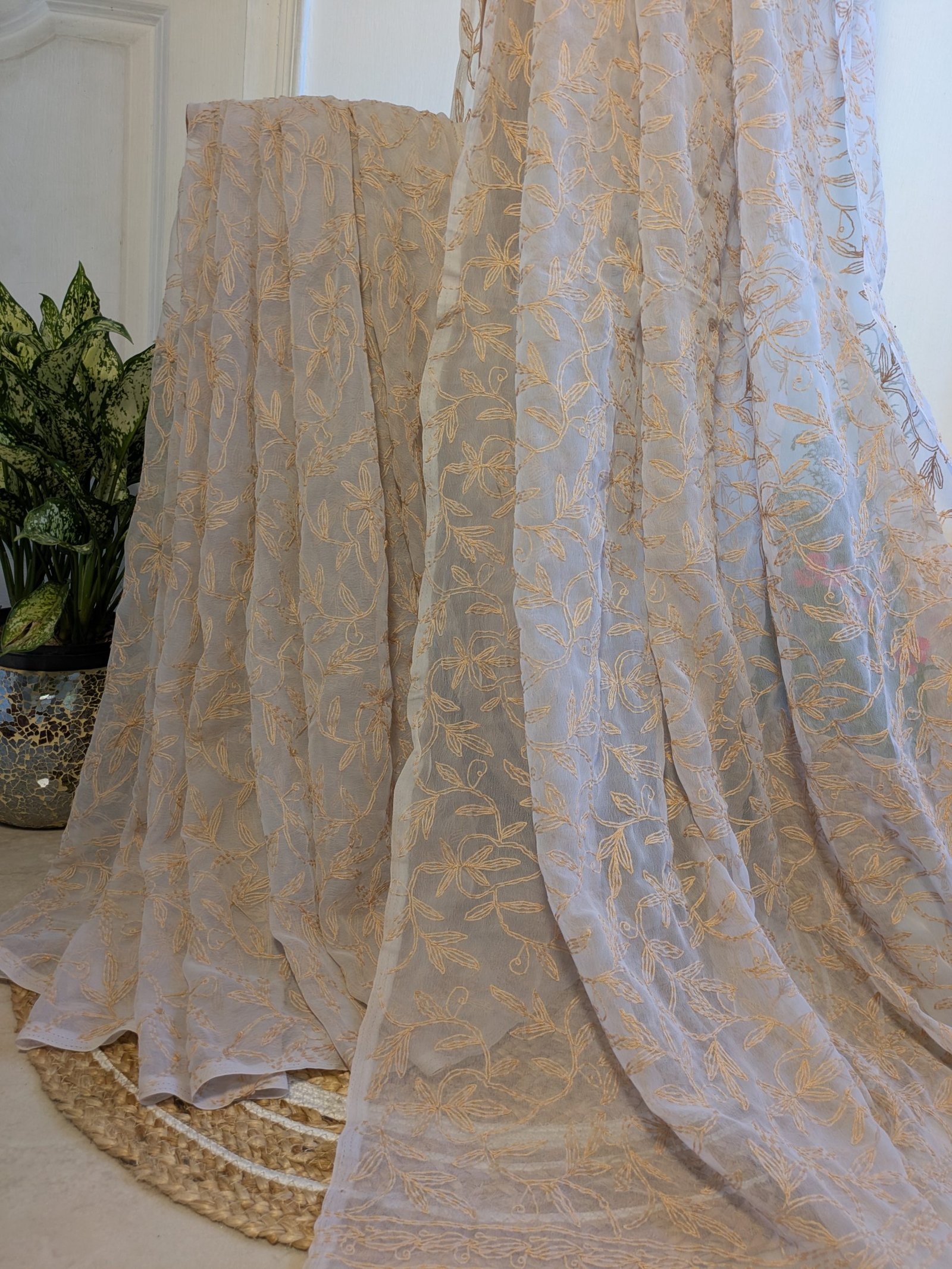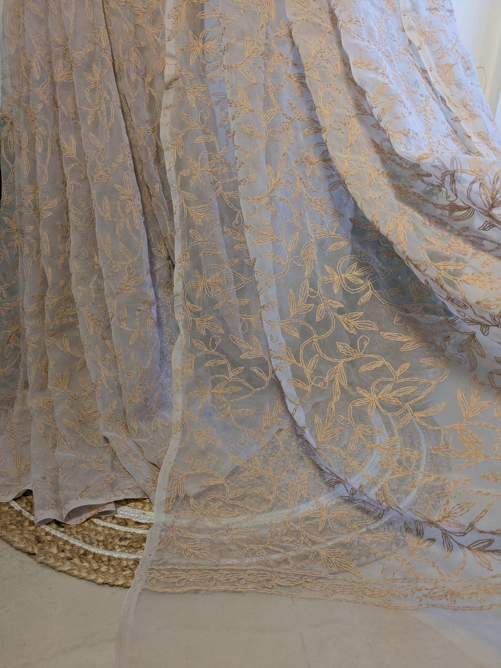 A timeless blend of grace and craftsmanship, this grey Chikankari saree is adorned with intricate teaching work, adding depth and artistry to its delicate embroidery. Crafted from lightweight georgette fabric, it drapes beautifully, offering a flowy and effortless look. Perfect for festive occasions, formal gatherings, or evening wear, this saree exudes understated elegance with every fold.