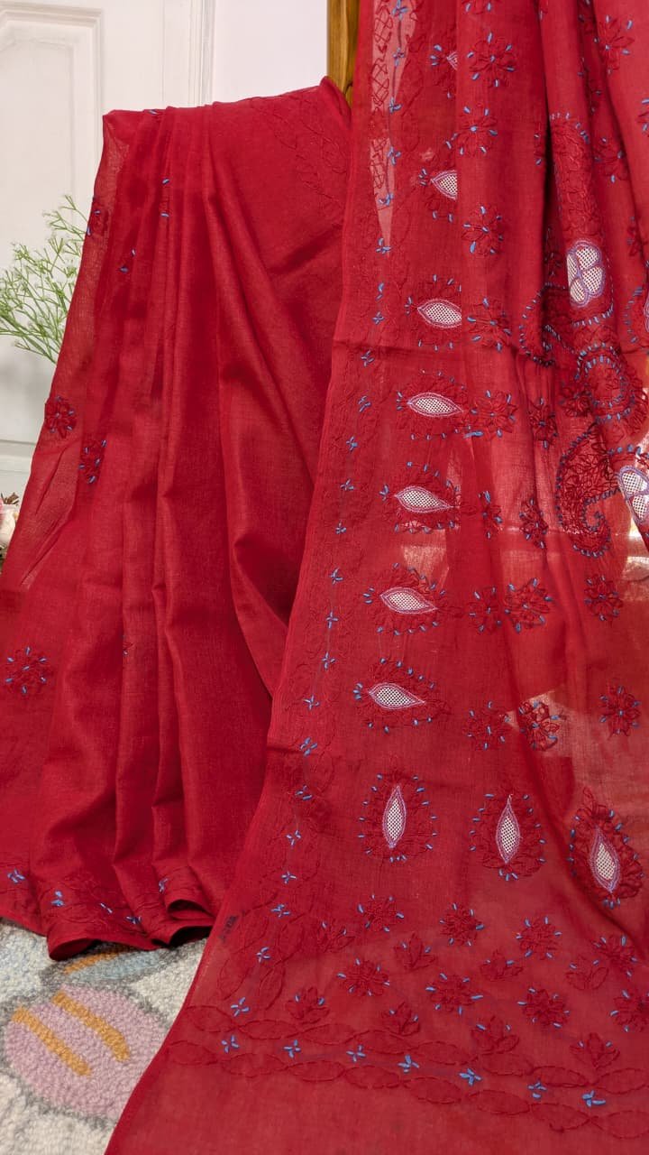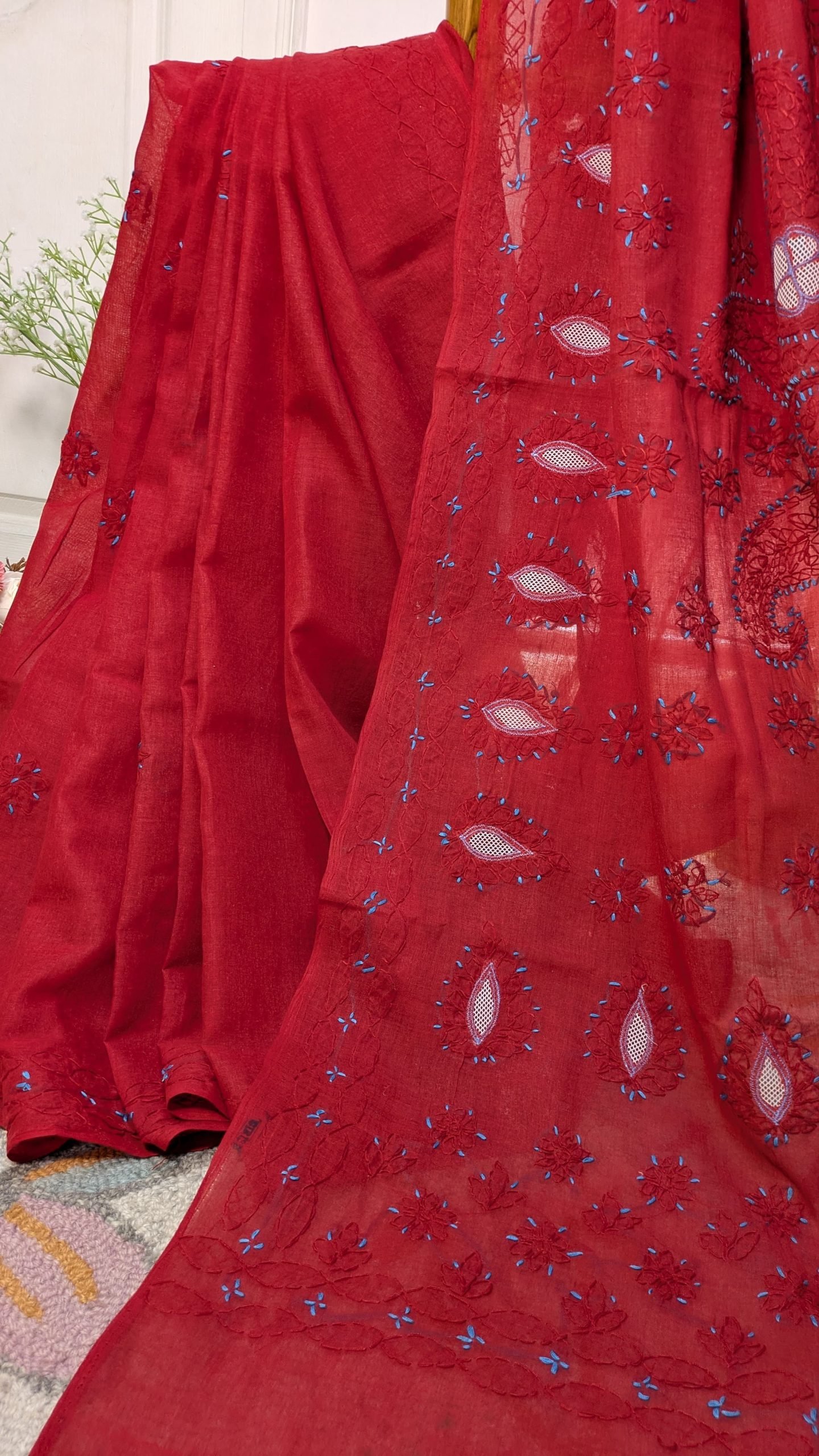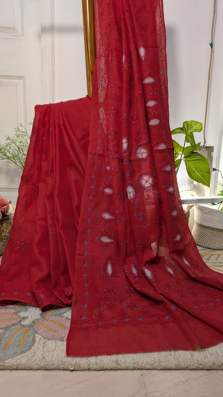 “CRIMSON SAGA” PURE COTTON CHIKANKARI SAREE