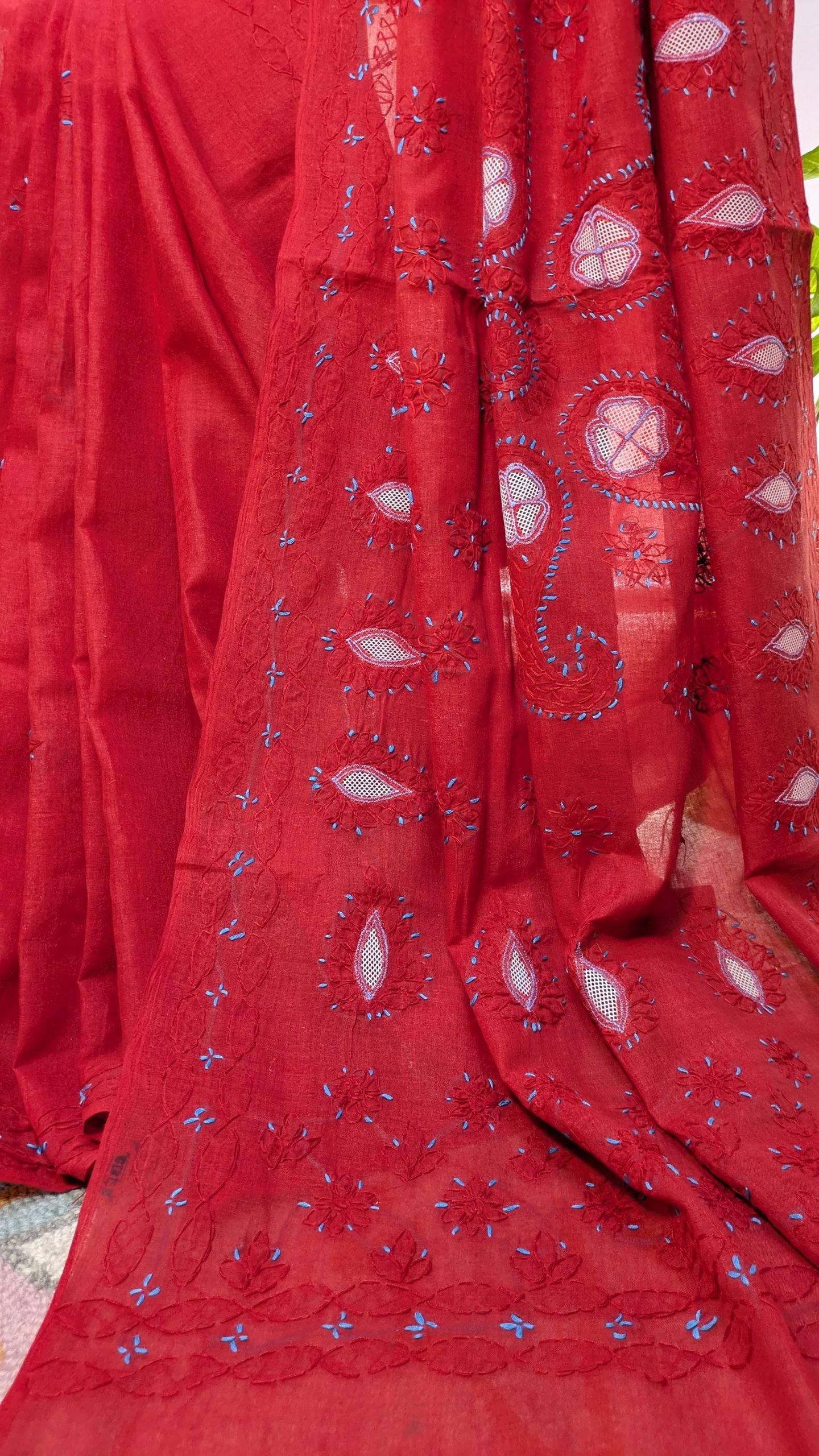 Embrace the timeless beauty of handcrafted elegance with our Red Chikankari Saree, intricately worked with multicoloured thread embroidery that brings a vibrant twist to the classic craft.