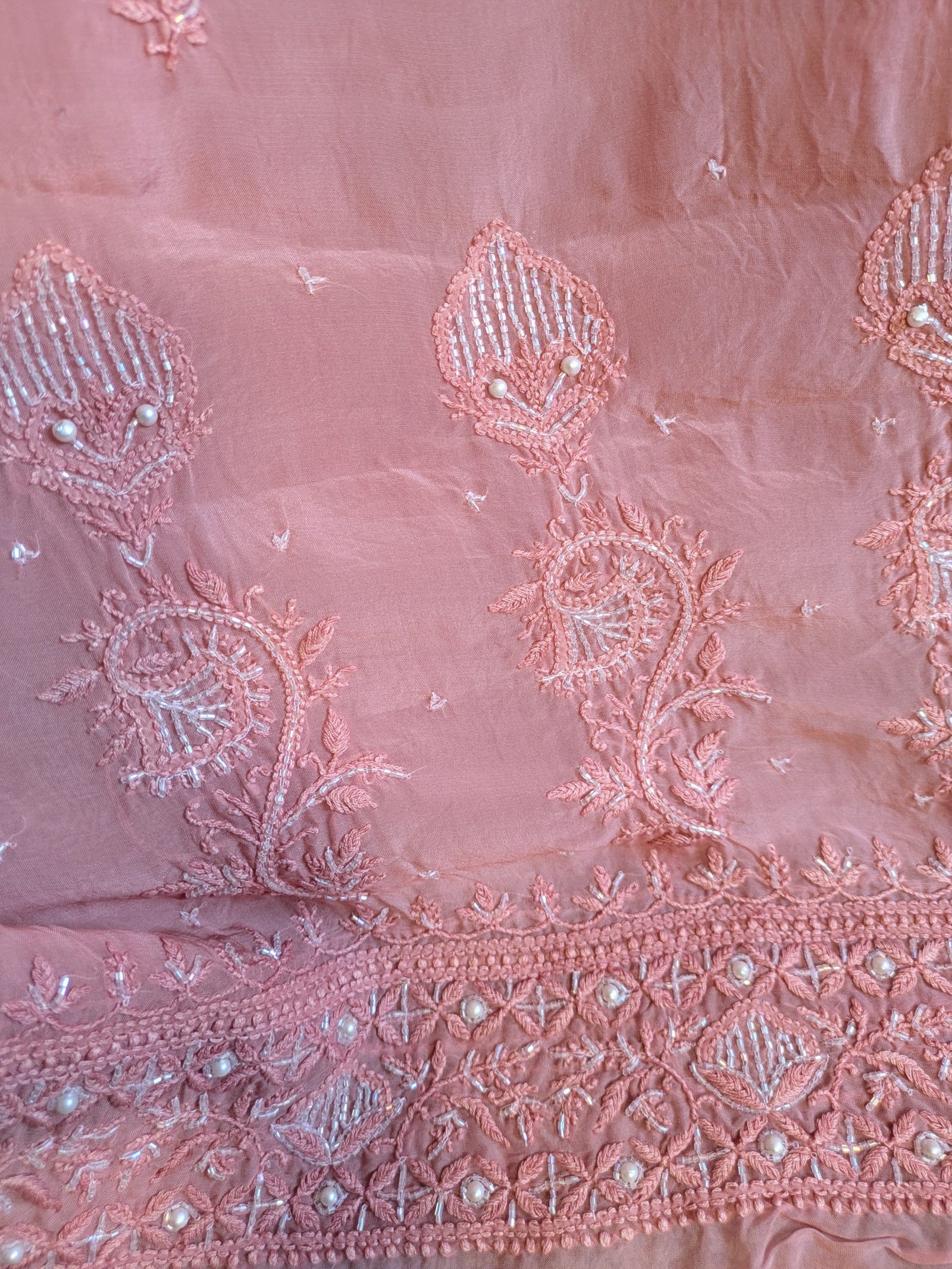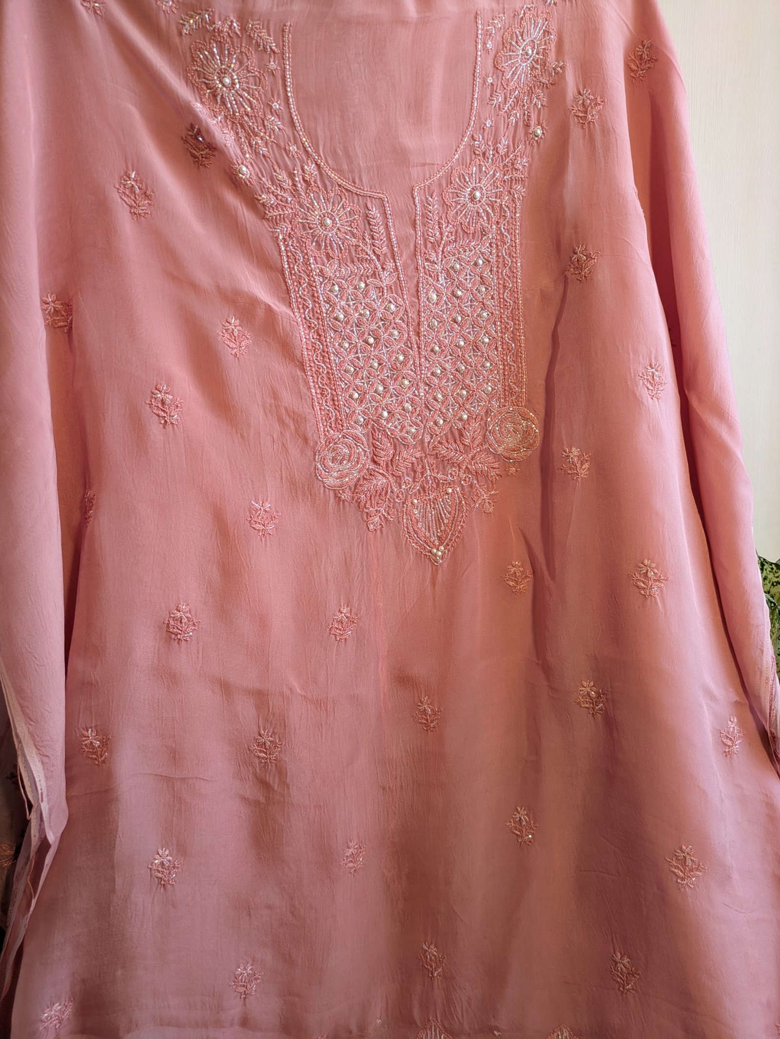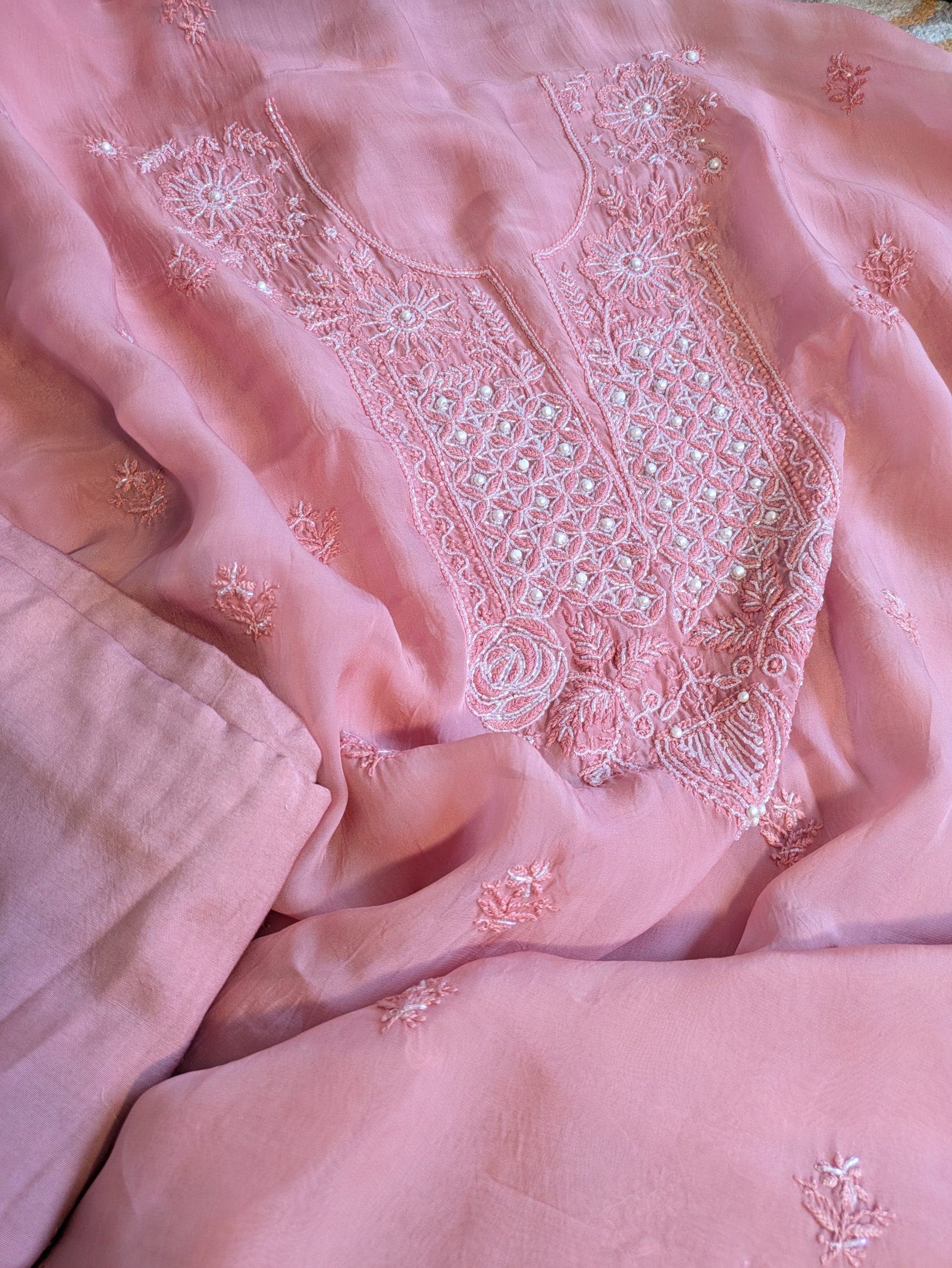 Crafted from premium sheer organza, the kurta fabric is adorned with intricate pink thread embroidery, enhanced by cutdana and sequin work that catches the light with every movement. The soft shine of sequins and the delicate shimmer of cutdana add a festive charm, while the tonal embroidery keeps the look sophisticated and feminine.