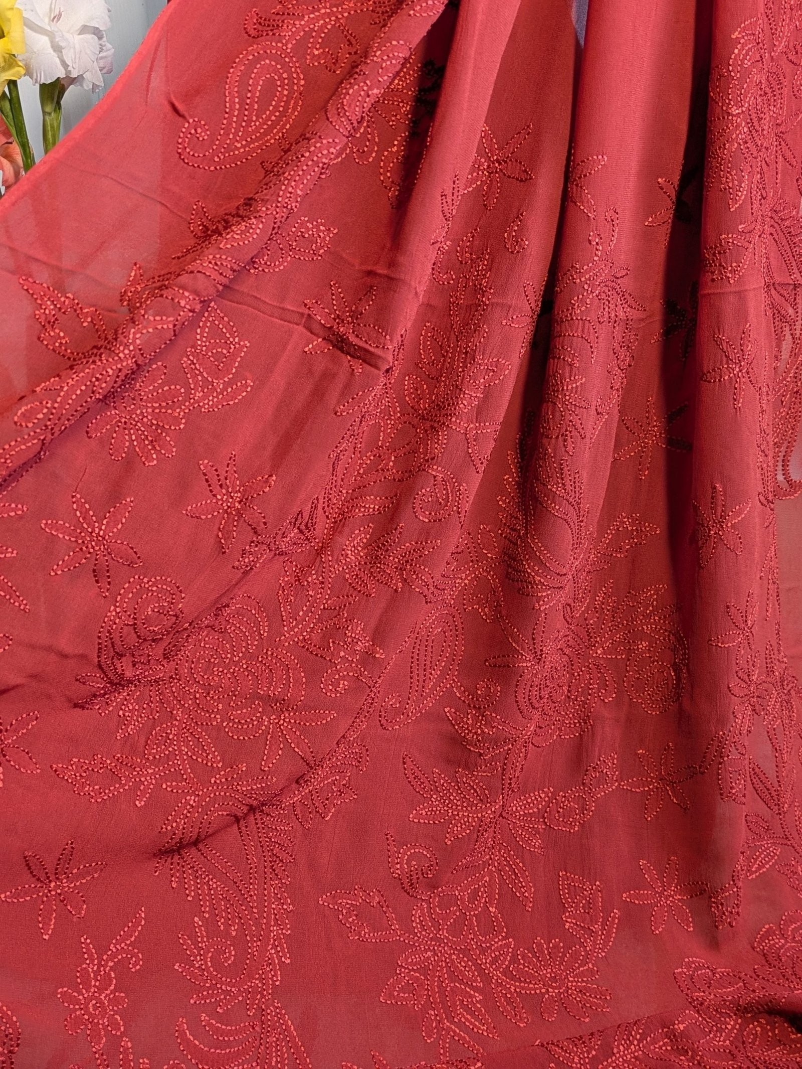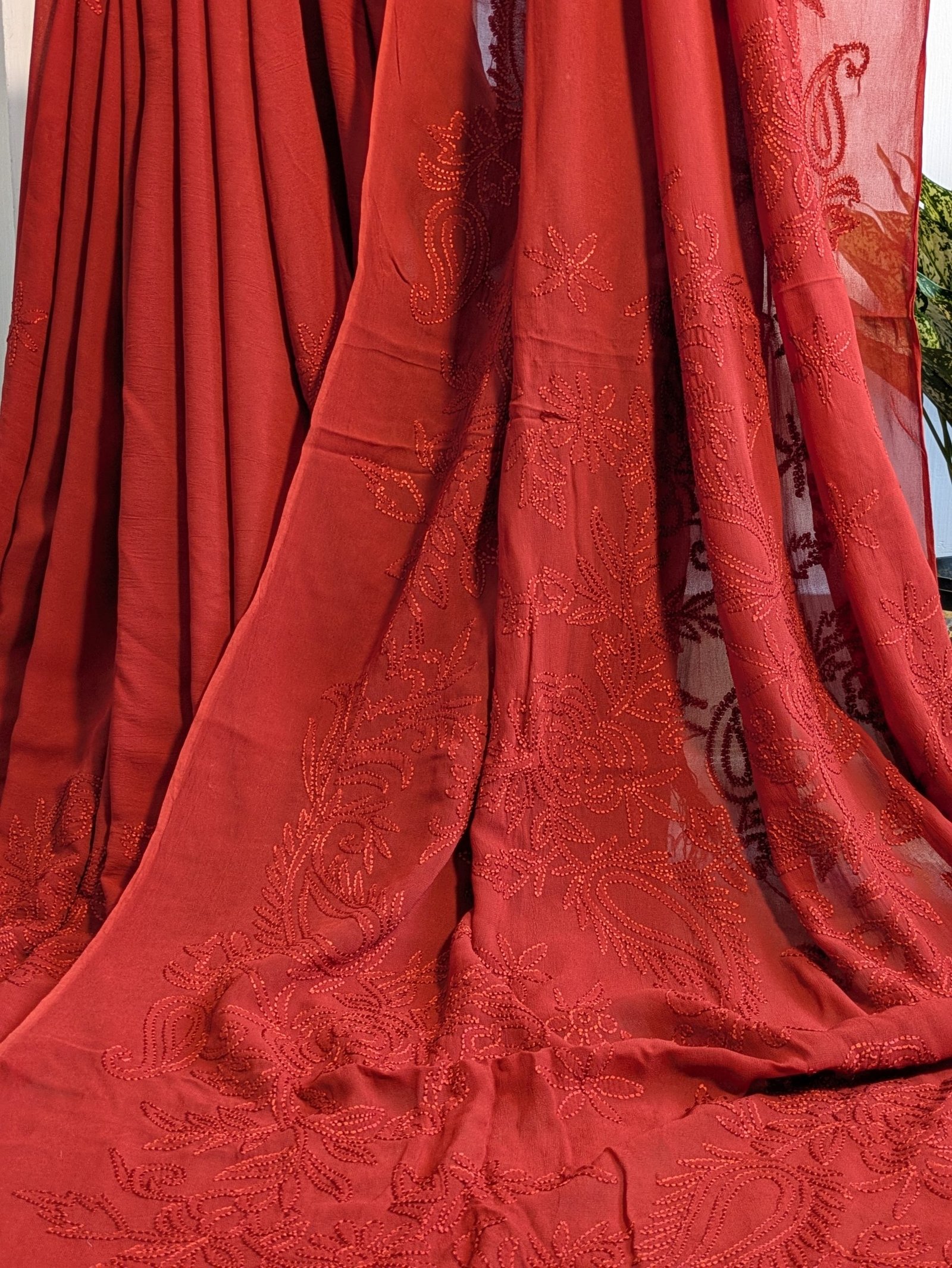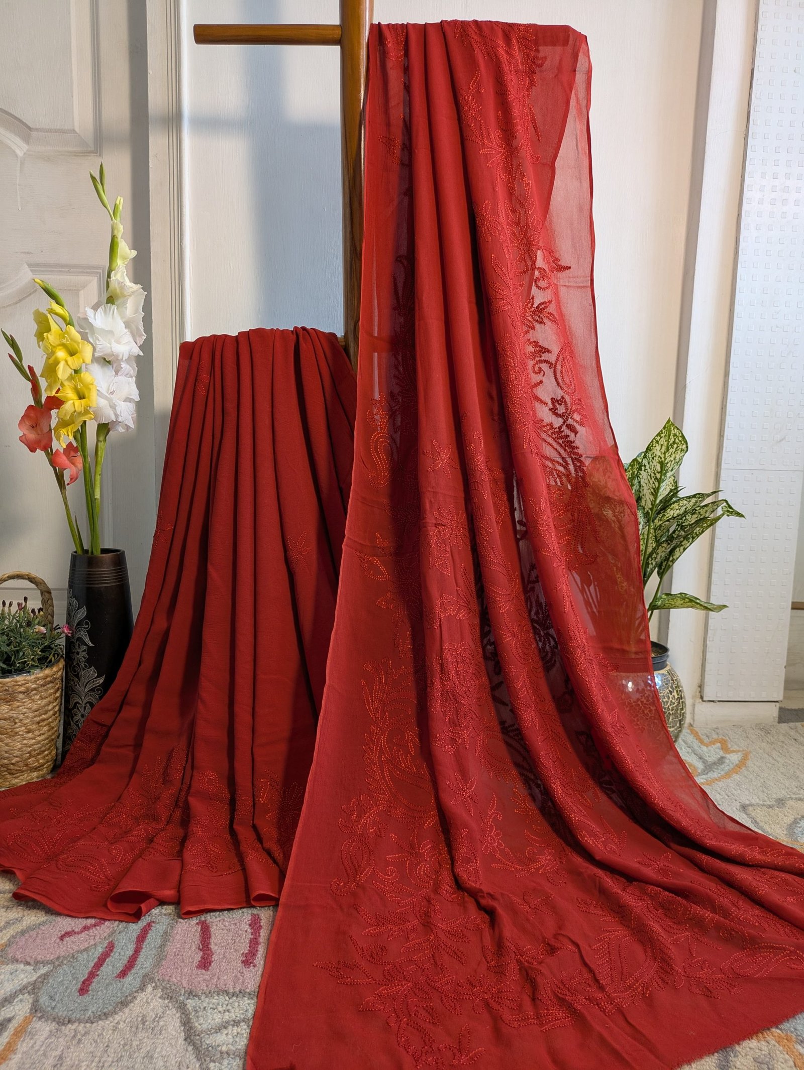 Elevate your elegance with this exquisite brick red Chikankari saree, intricately handcrafted with resham thread embroidery in a stunning tone-on-tone monochrome style. The delicate Lucknowi Chikankari work seamlessly blends with the rich brick red fabric, creating a timeless piece that embodies grace, tradition, and artistry. Perfect for both festive and formal occasions, this saree is a celebration of heritage wrapped in understated sophistication.