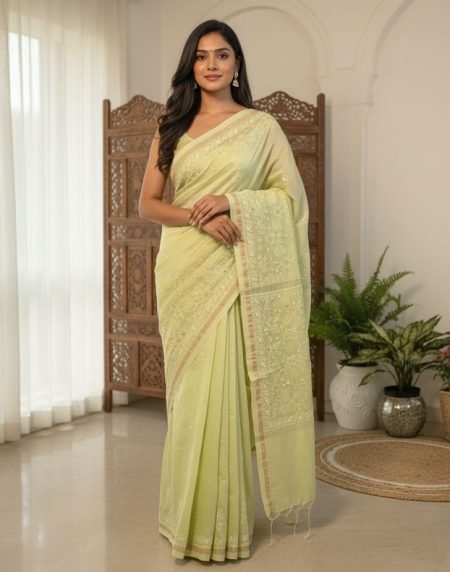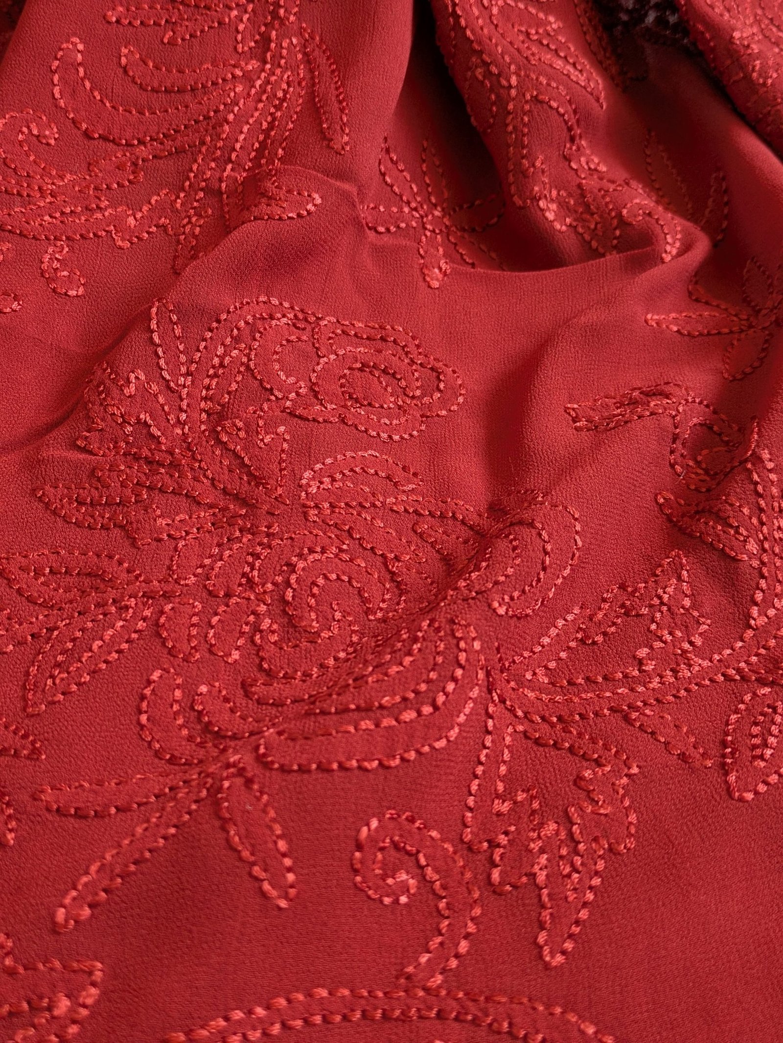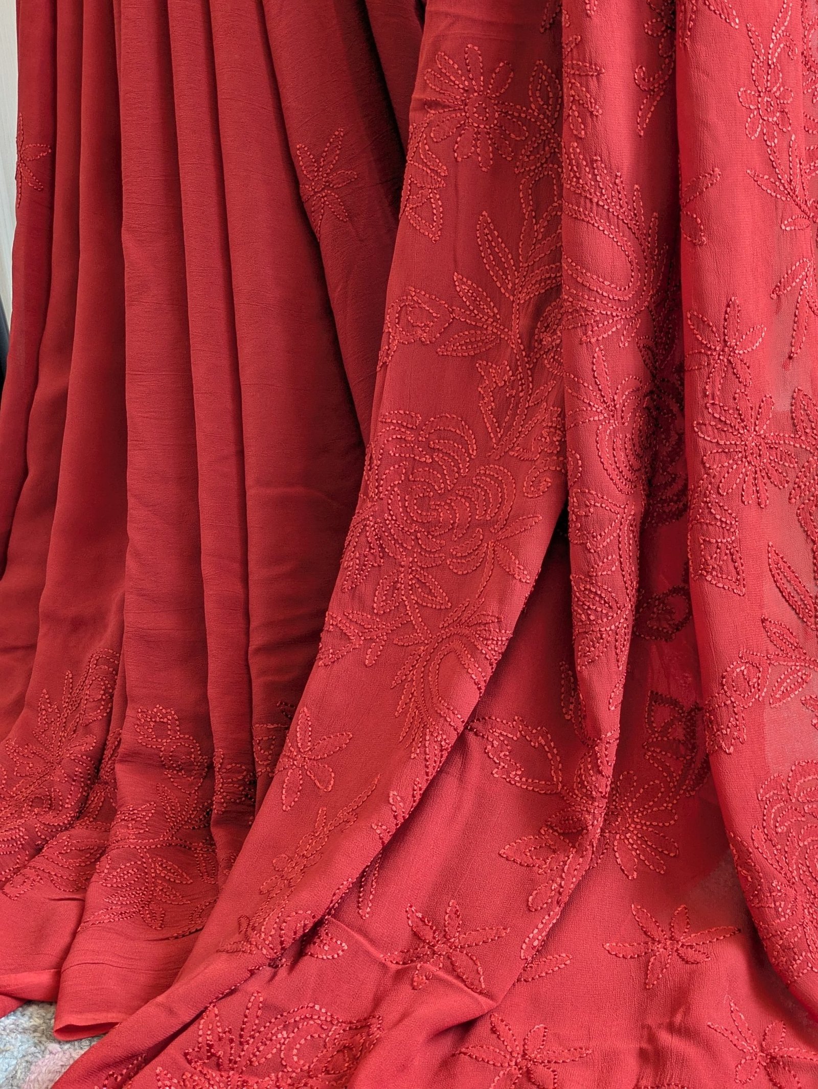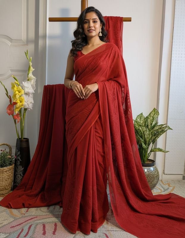 Elevate your elegance with this exquisite brick red Chikankari saree, intricately handcrafted with resham thread embroidery in a stunning tone-on-tone monochrome style. The delicate Lucknowi Chikankari work seamlessly blends with the rich brick red fabric, creating a timeless piece that embodies grace, tradition, and artistry. Perfect for both festive and formal occasions, this saree is a celebration of heritage wrapped in understated sophistication.
