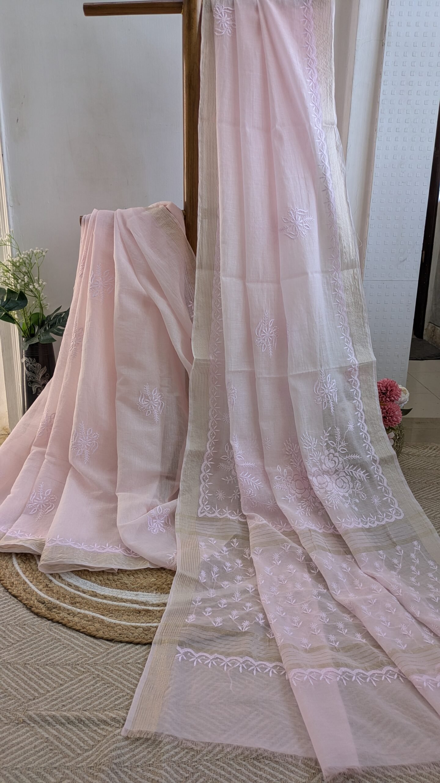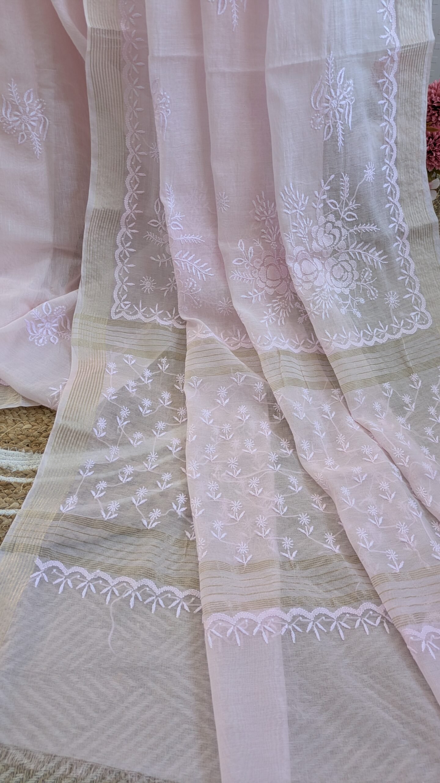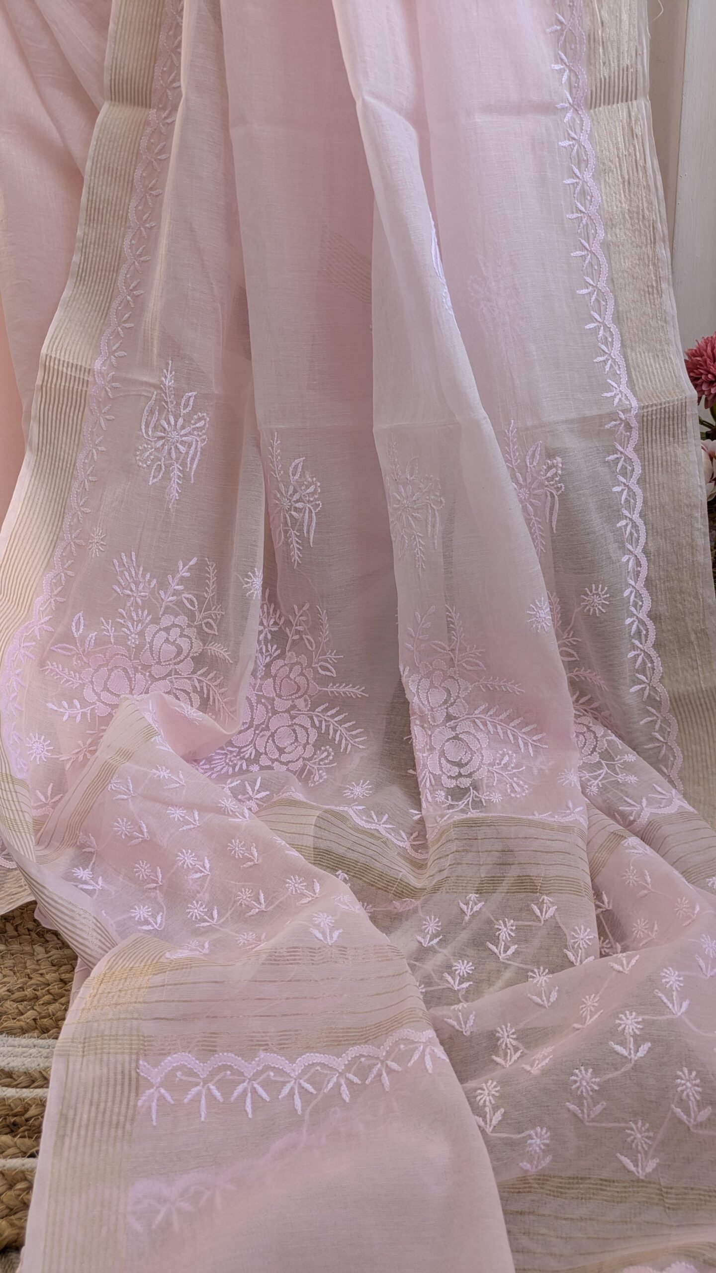 Soft, graceful, and effortlessly elegant, this light pink Mul Chanderi Chikankari saree is a timeless addition to your wardrobe. Crafted from premium Mul Chanderi fabric, it is lightweight, breathable, and exceptionally comfortable, making it a perfect choice for the summer season. The saree is beautifully adorned with fine Chikankari thread work, showcasing the delicate craftsmanship and timeless charm of Lucknowi artistry. A graceful zari border enhances its beauty with a subtle shimmer, adding a festive and sophisticated touch without overpowering the soft elegance of the saree. The soothing light pink hue lends a feminine and refreshing appeal, ideal for day functions, summer gatherings, poojas, festive brunches, and intimate celebrations. Easy to drape and comfortable to carry throughout the day, this saree perfectly combines traditional craftsmanship with modern elegance, making it a must-have for those who appreciate understated luxury.