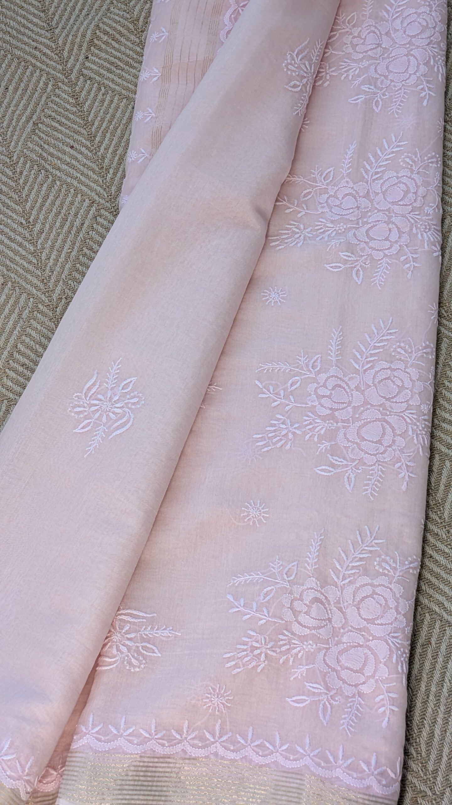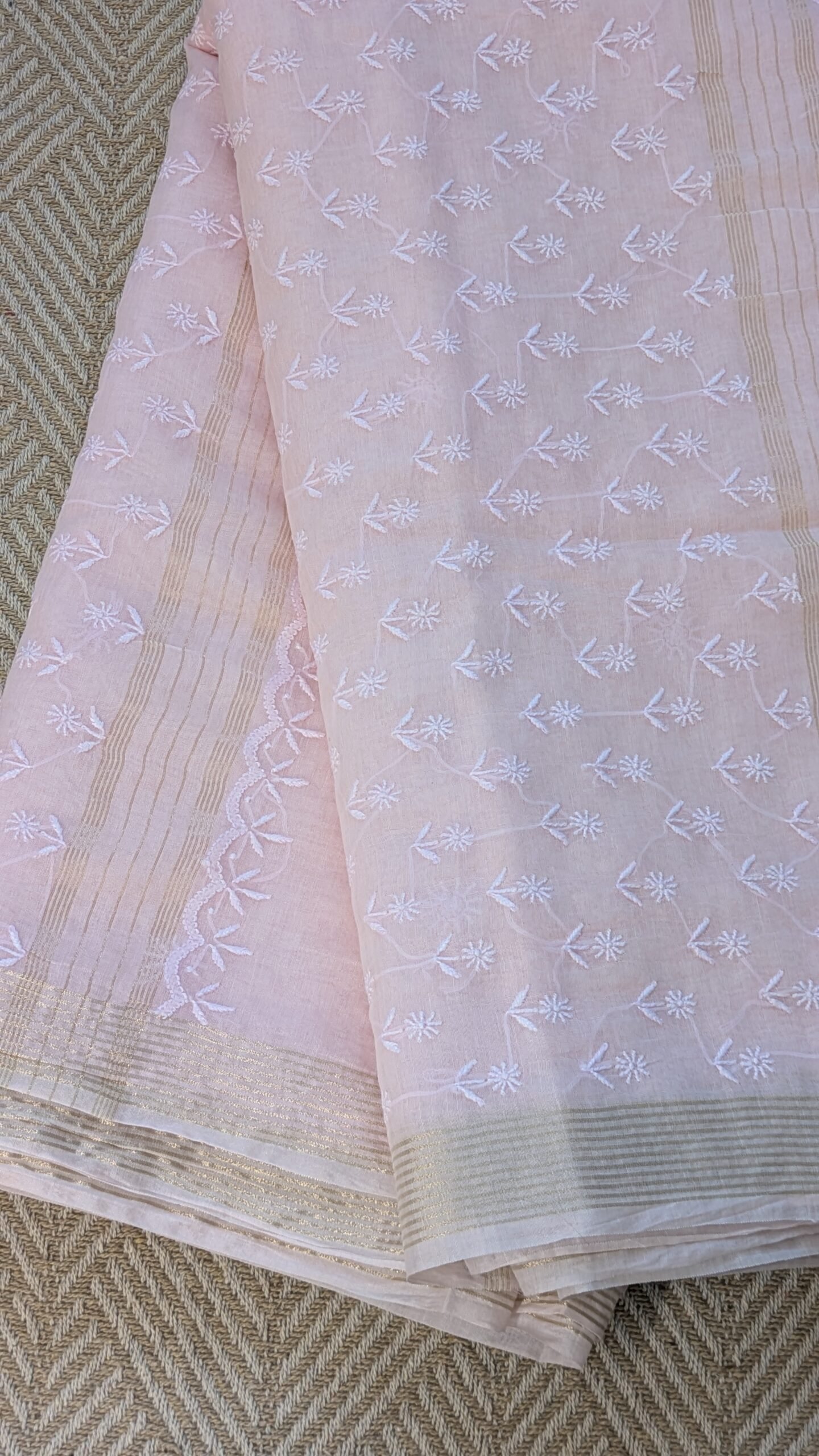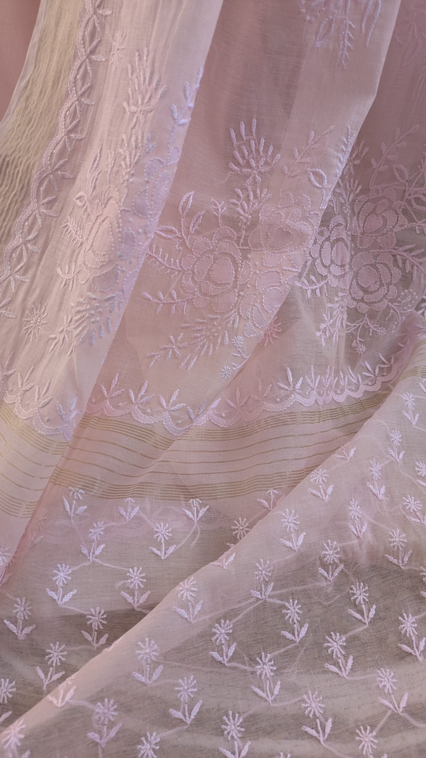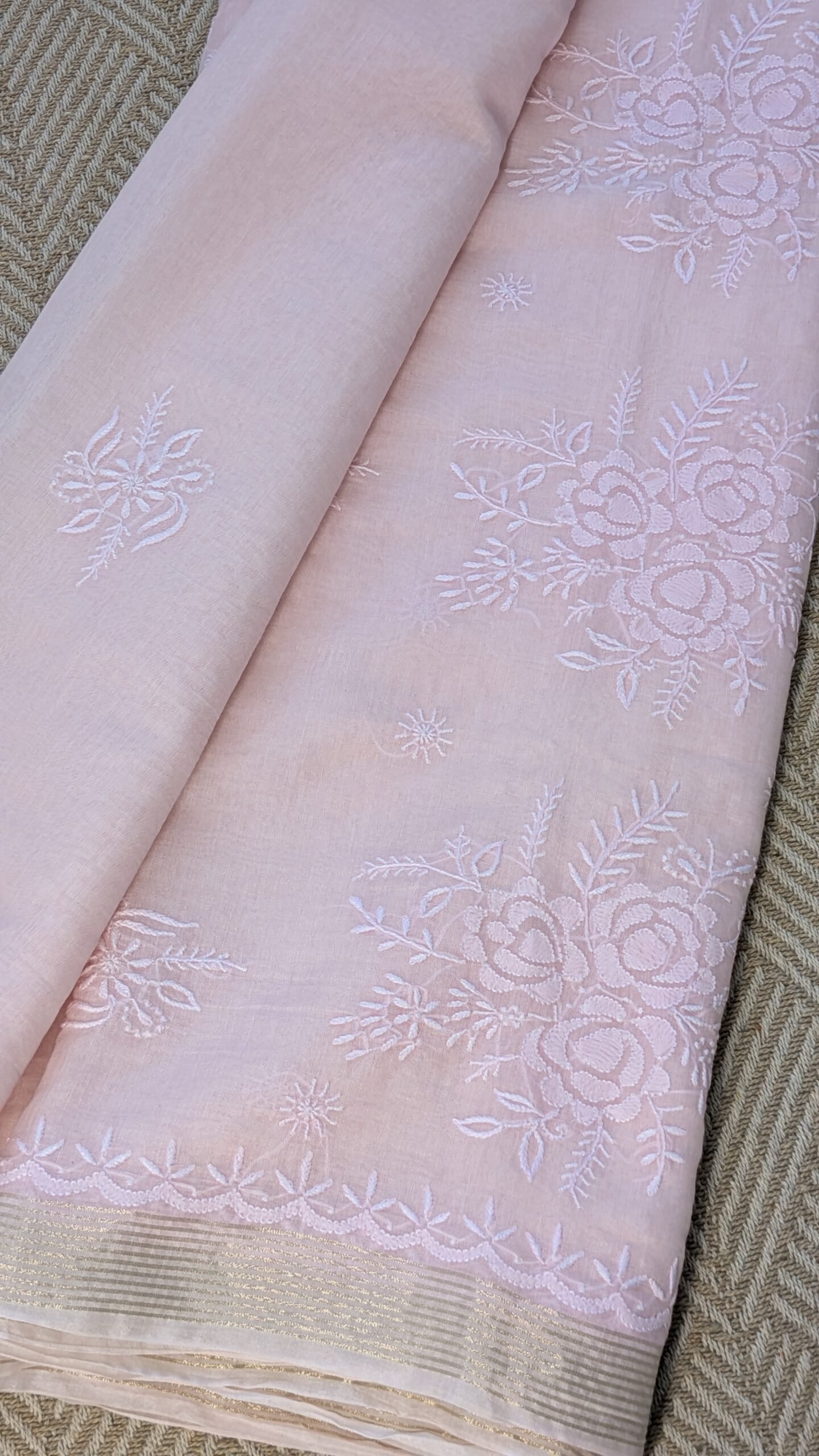 Soft, graceful, and effortlessly elegant, this light pink Mul Chanderi Chikankari saree is a timeless addition to your wardrobe. Crafted from premium Mul Chanderi fabric, it is lightweight, breathable, and exceptionally comfortable, making it a perfect choice for the summer season. The saree is beautifully adorned with fine Chikankari thread work, showcasing the delicate craftsmanship and timeless charm of Lucknowi artistry. A graceful zari border enhances its beauty with a subtle shimmer, adding a festive and sophisticated touch without overpowering the soft elegance of the saree. The soothing light pink hue lends a feminine and refreshing appeal, ideal for day functions, summer gatherings, poojas, festive brunches, and intimate celebrations. Easy to drape and comfortable to carry throughout the day, this saree perfectly combines traditional craftsmanship with modern elegance, making it a must-have for those who appreciate understated luxury.
