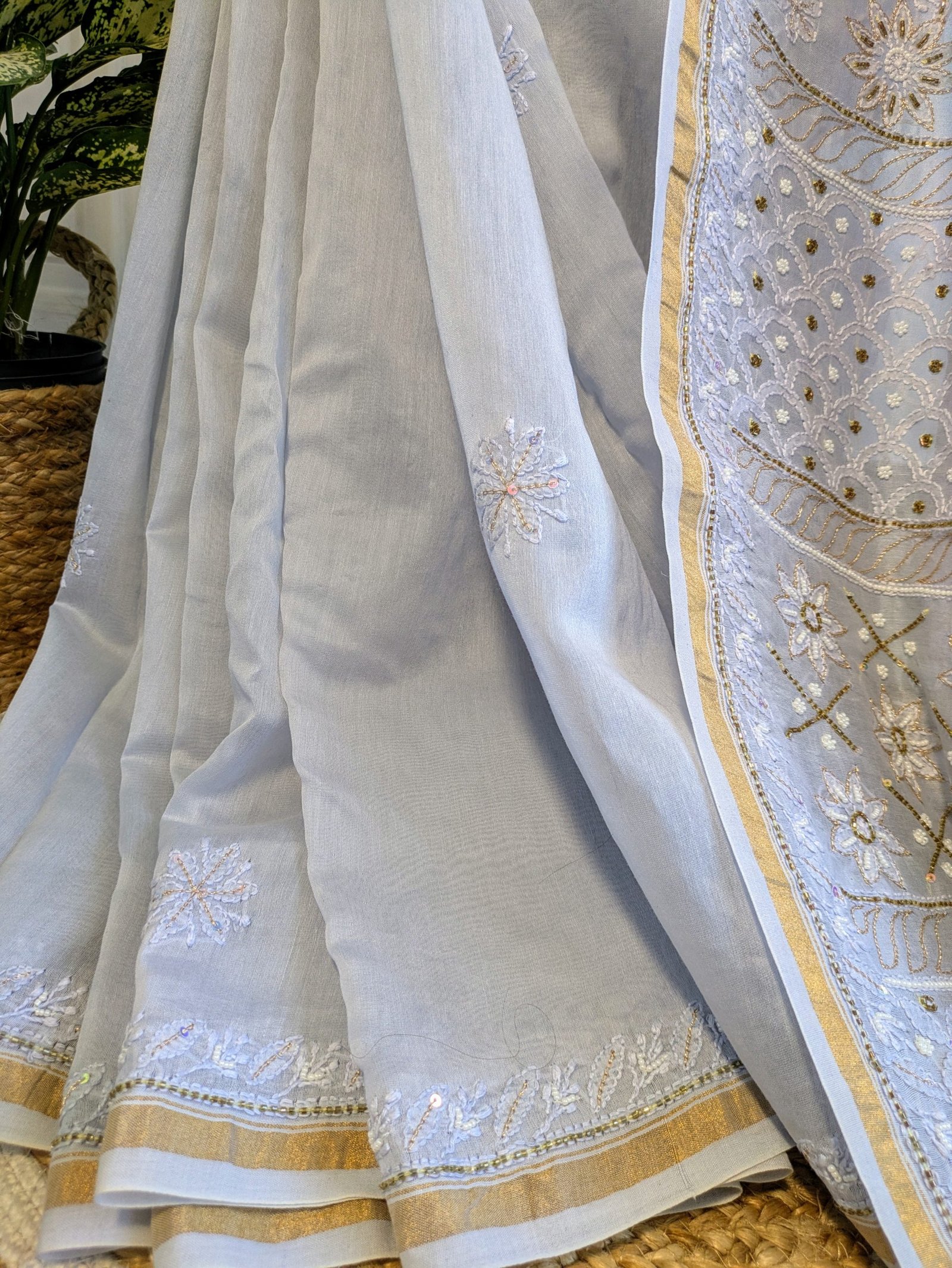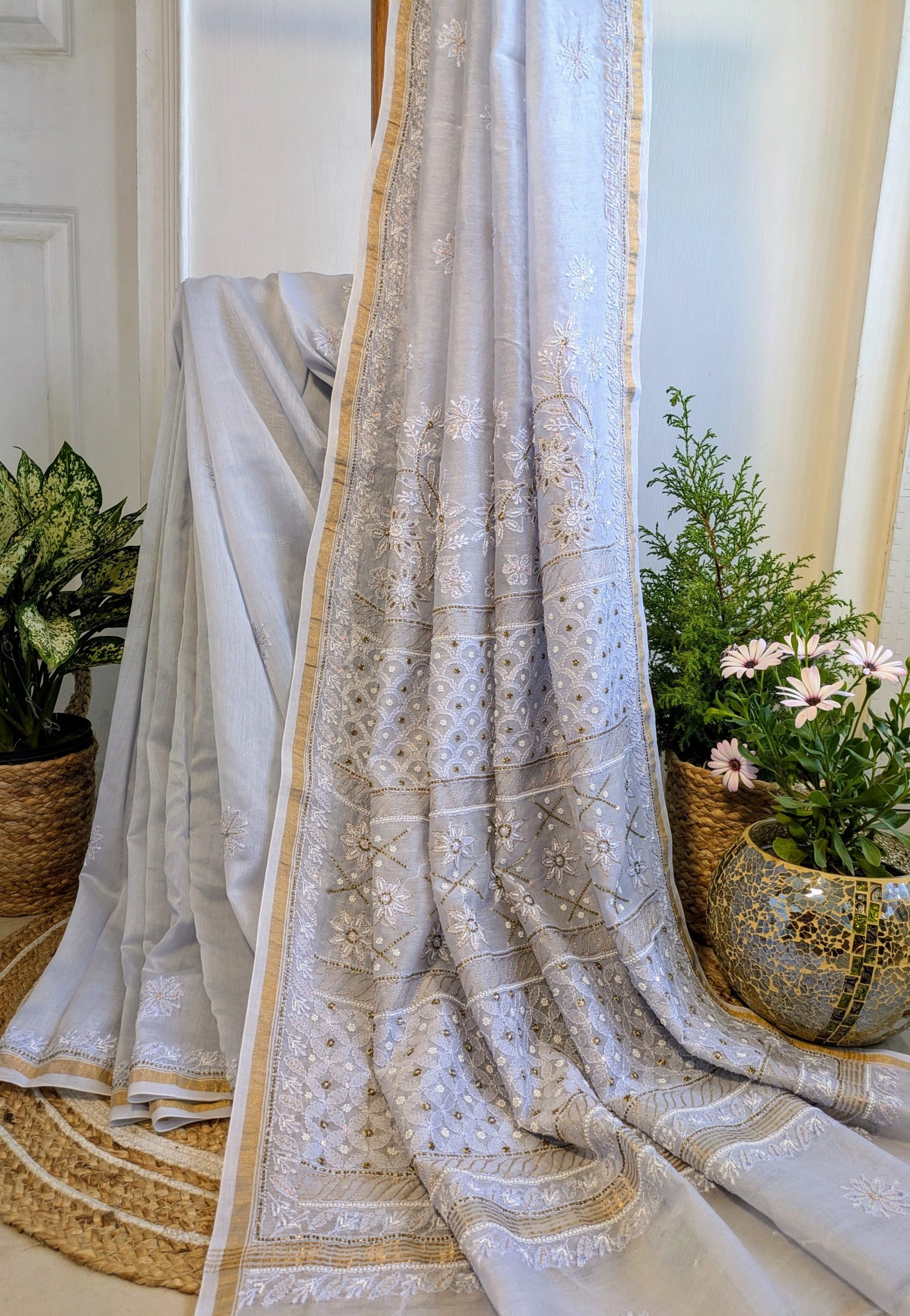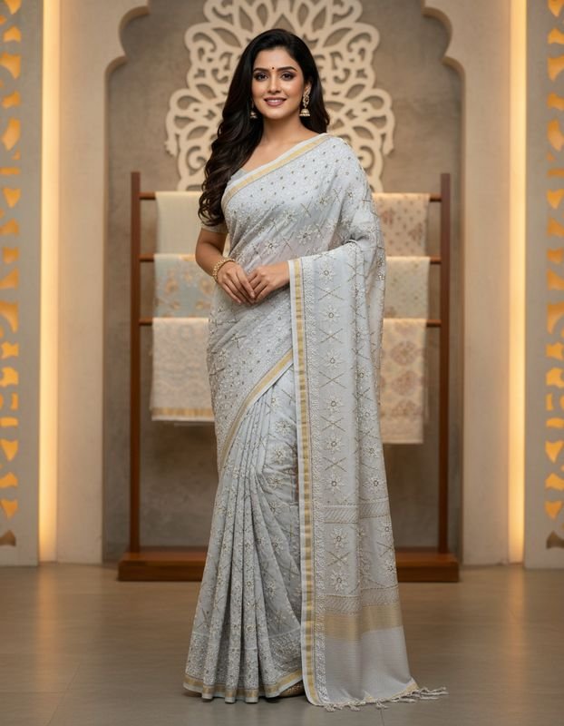 This sky-blue chikankari saree features delicate hand-embroidered motifs that showcase the timeless beauty of traditional craftsmanship. 💙💙Accentuated with intricate zari work , this saree adds a subtle shimmer , creating a perfect blend of elegance and tradition.