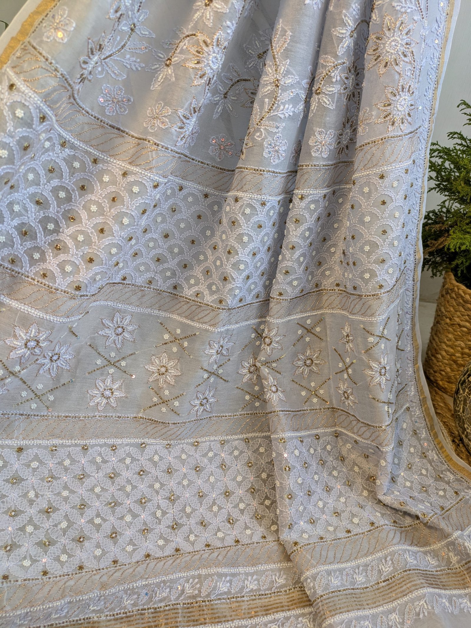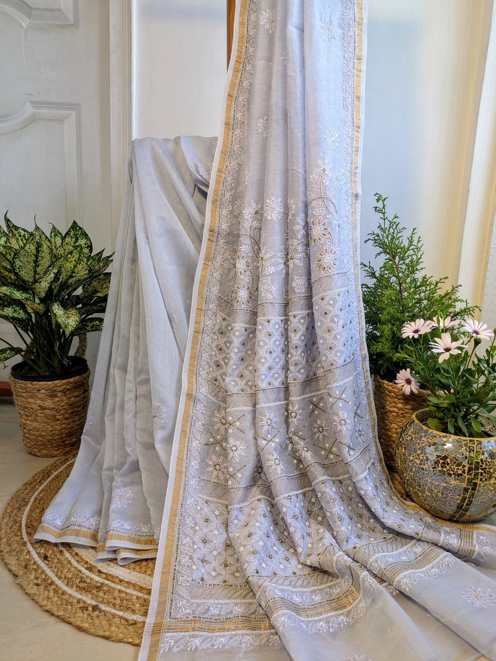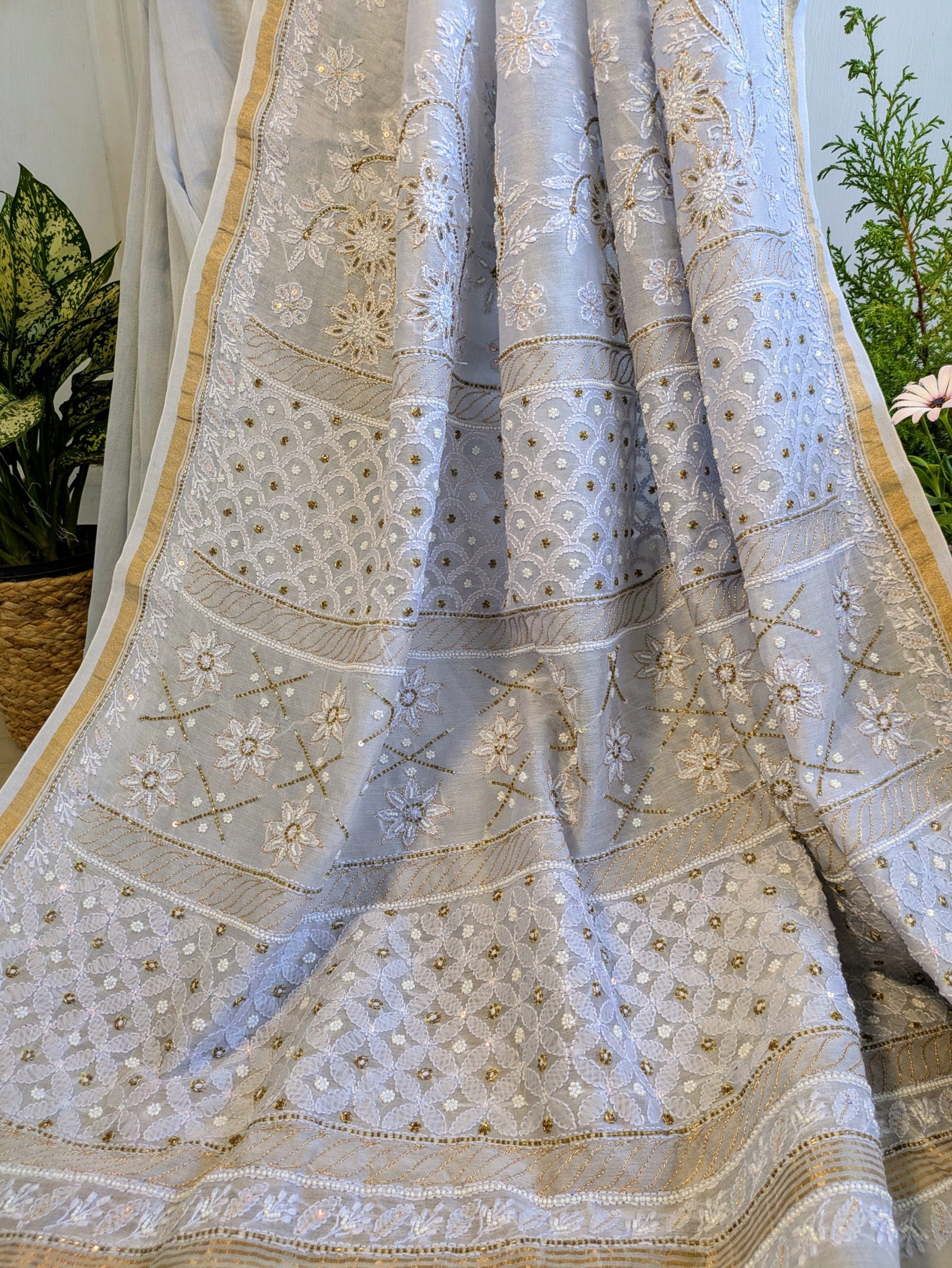 This sky-blue chikankari saree features delicate hand-embroidered motifs that showcase the timeless beauty of traditional craftsmanship. 💙💙Accentuated with intricate zari work , this saree adds a subtle shimmer , creating a perfect blend of elegance and tradition.