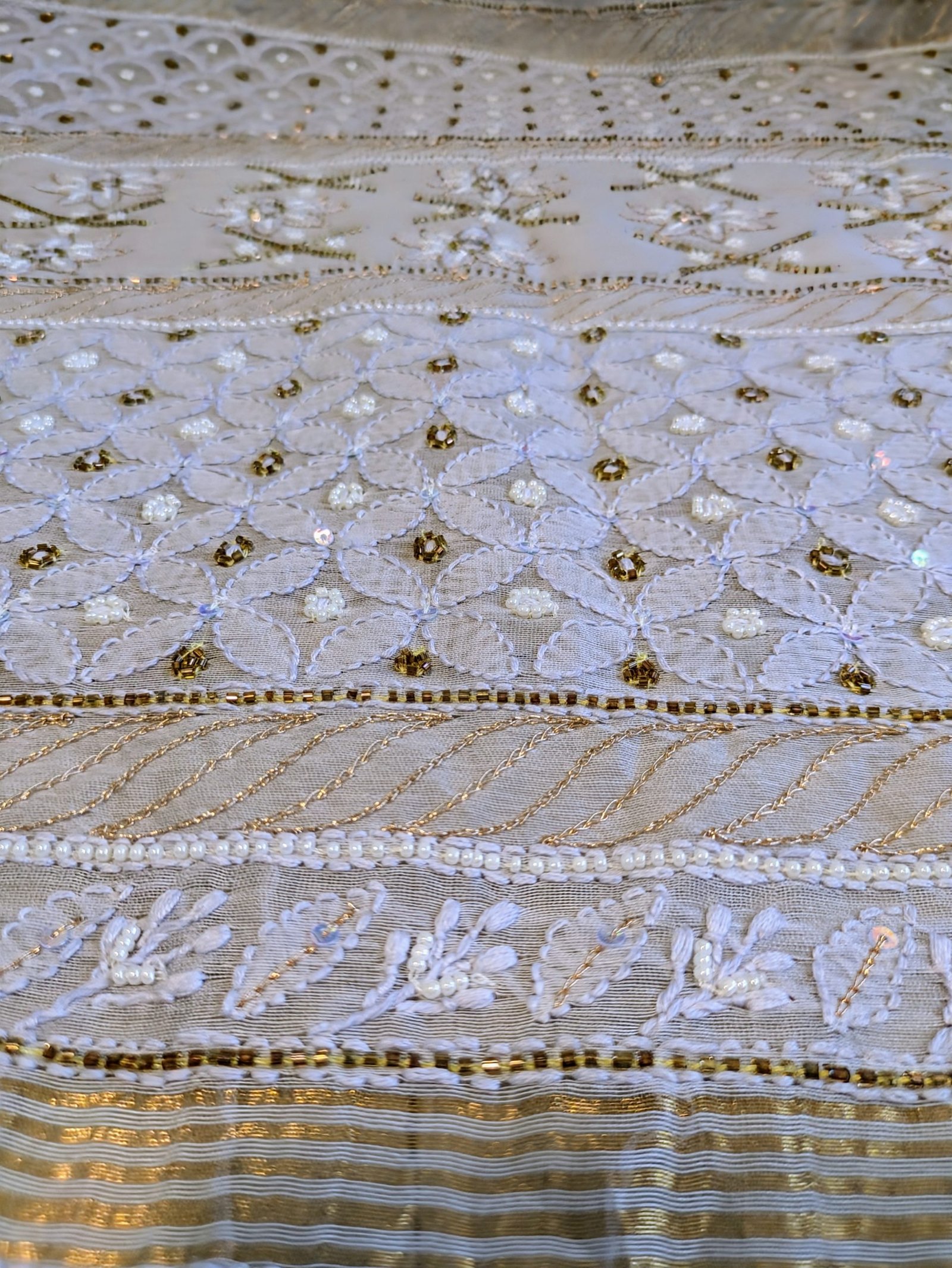 - Embellishments: intricately embellished with shimmering cutdana, delicate pearls, rich golden zari, and fine blue thread embroidery.