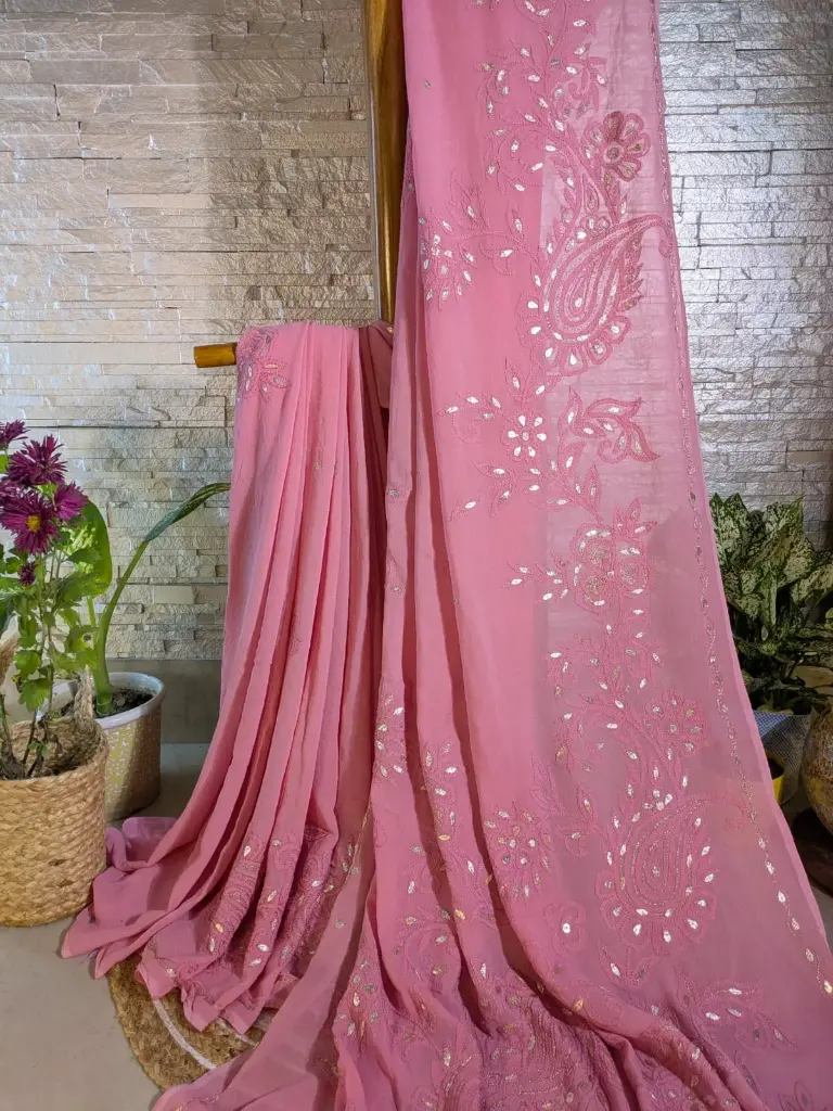 The stunning pyajii pink hue — a delicate blend of mauve and onion pink — brings a soft romanticism to the piece, making it perfect for both day and evening celebrations. Whether you’re attending a wedding function, sangeet, or a festive gathering, this saree is your effortless go-to.