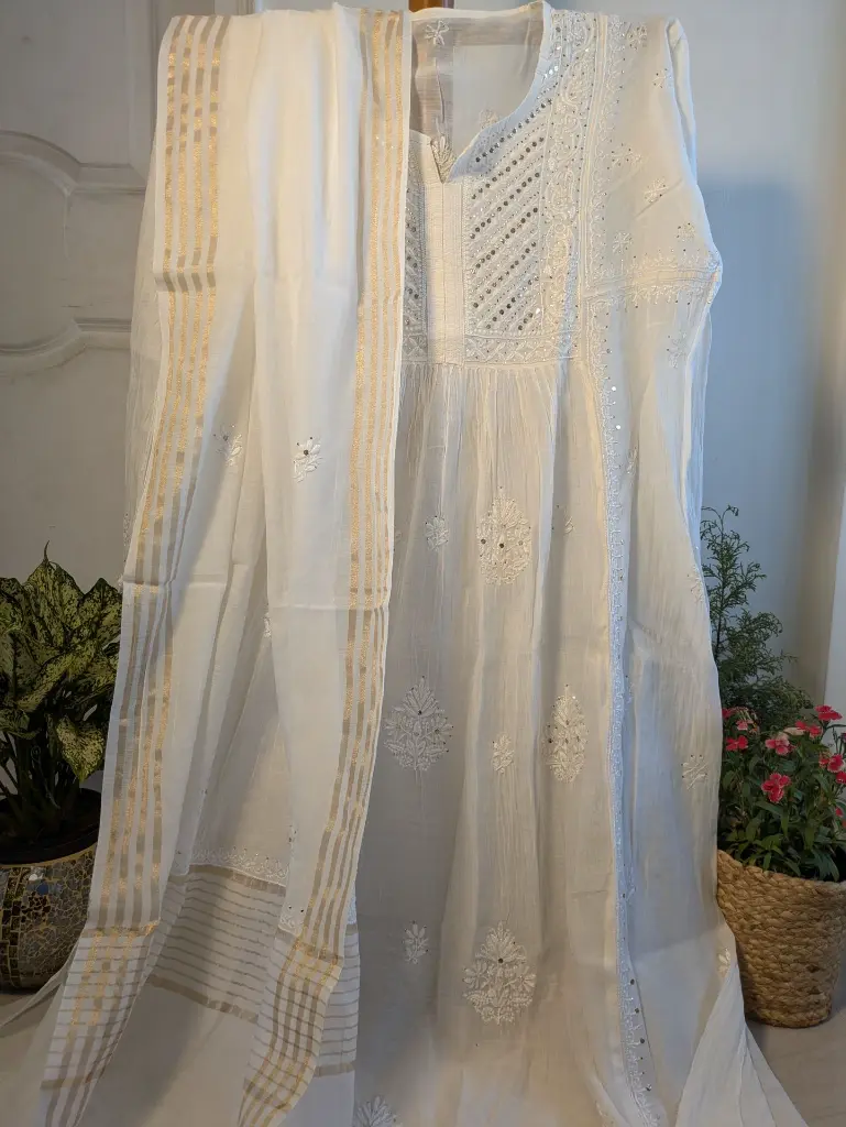 Crafted in soft and breathable Muk cotton, this unstitched white Chikankari fabric is adorned with intricate hand embroidery, enhanced by the delicate shimmer of Mukaish work. A perfect blend of tradition and elegance, this fabric allows you to create a bespoke outfit that exudes grace and sophistication. Ideal for festive and formal wear, it offers timeless beauty with a touch of subtle sparkle.