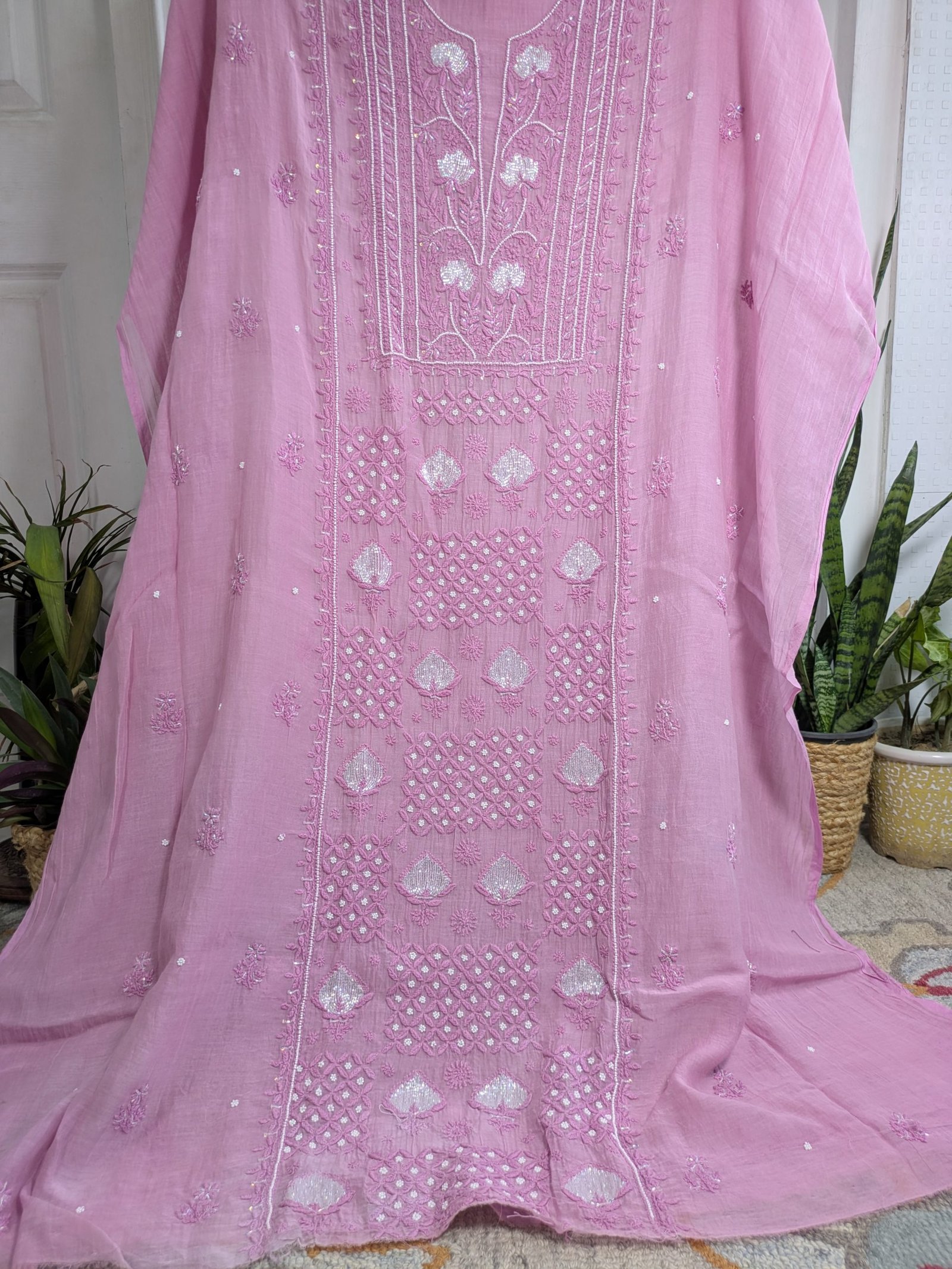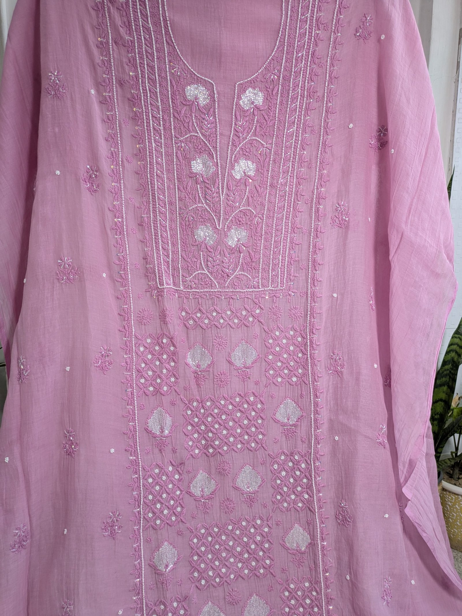 The kurta features intricate hand embellishments using pearls, cutdana, and sequins, delicately placed to create a graceful shimmer with every movement. Paired with coordinating straight pants and a soft mul cotton dupatta, this set is all about effortless elegance and handcrafted beauty.