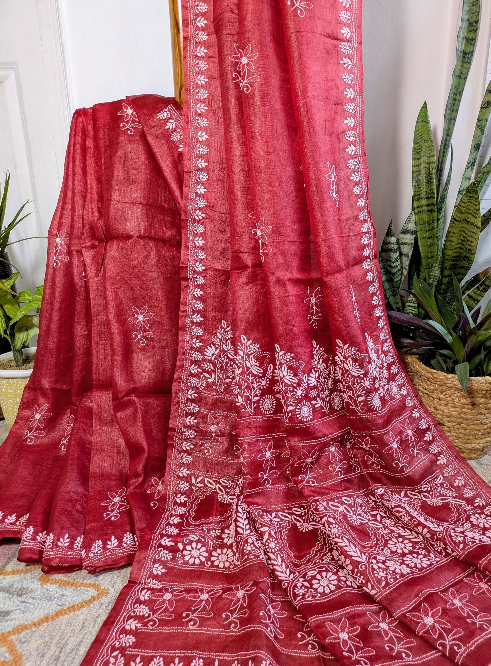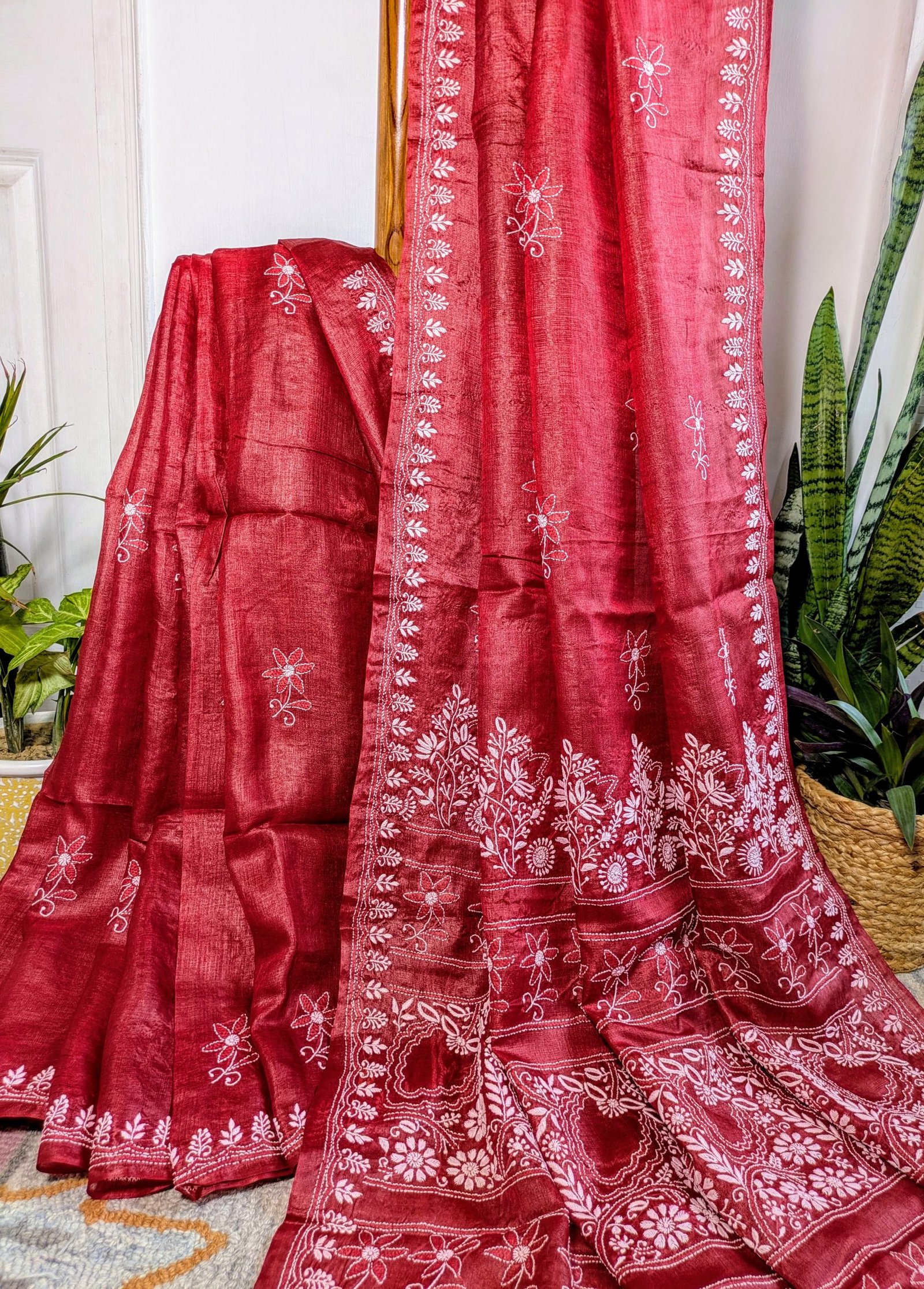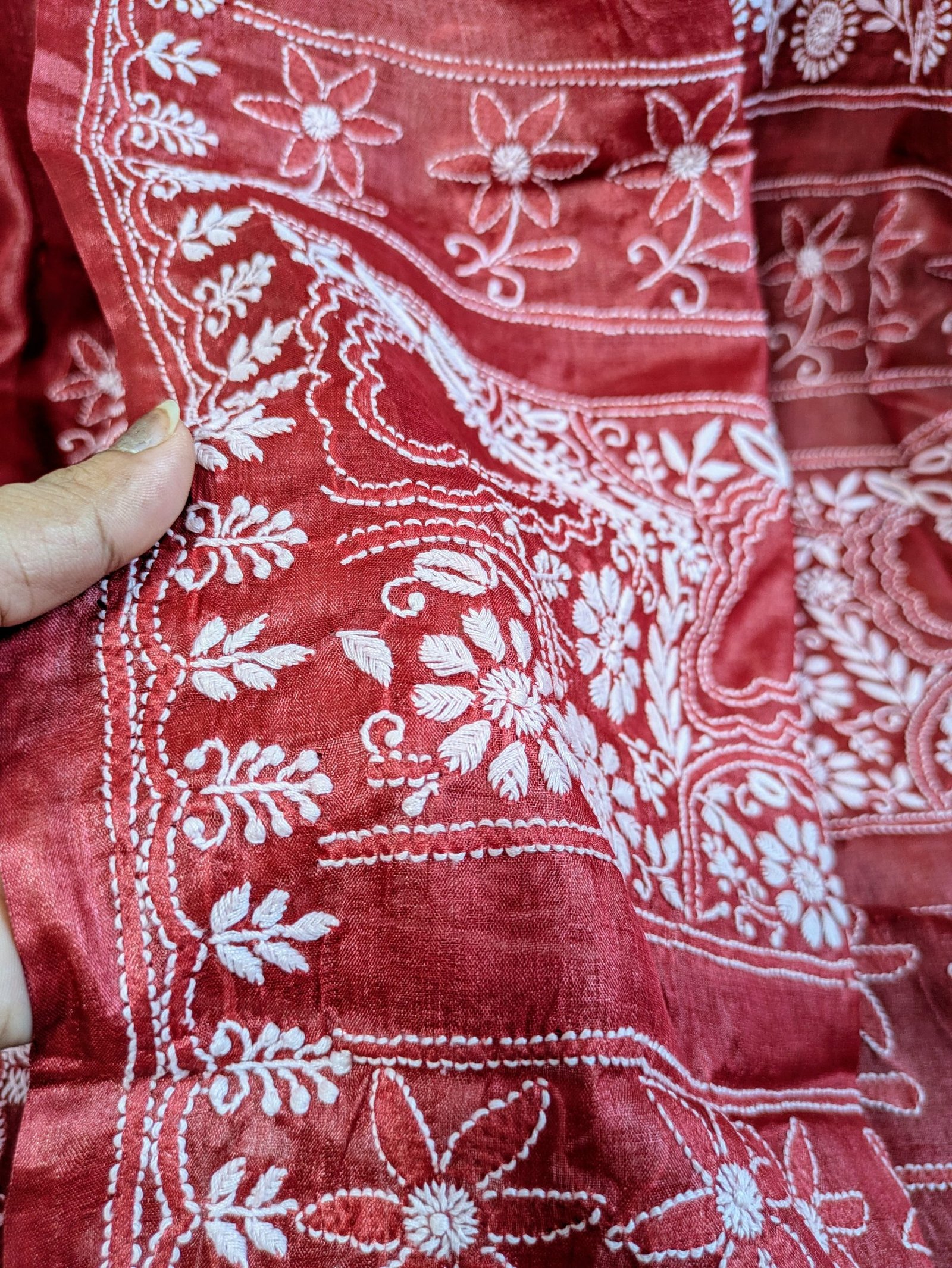 A breathtaking red Chikankari saree, beautifully handcrafted with intricate white thread embroidery and shimmering Mukaish work. This elegant masterpiece blends traditional artistry with a touch of glamour, making it perfect for festive and celebratory occasions.