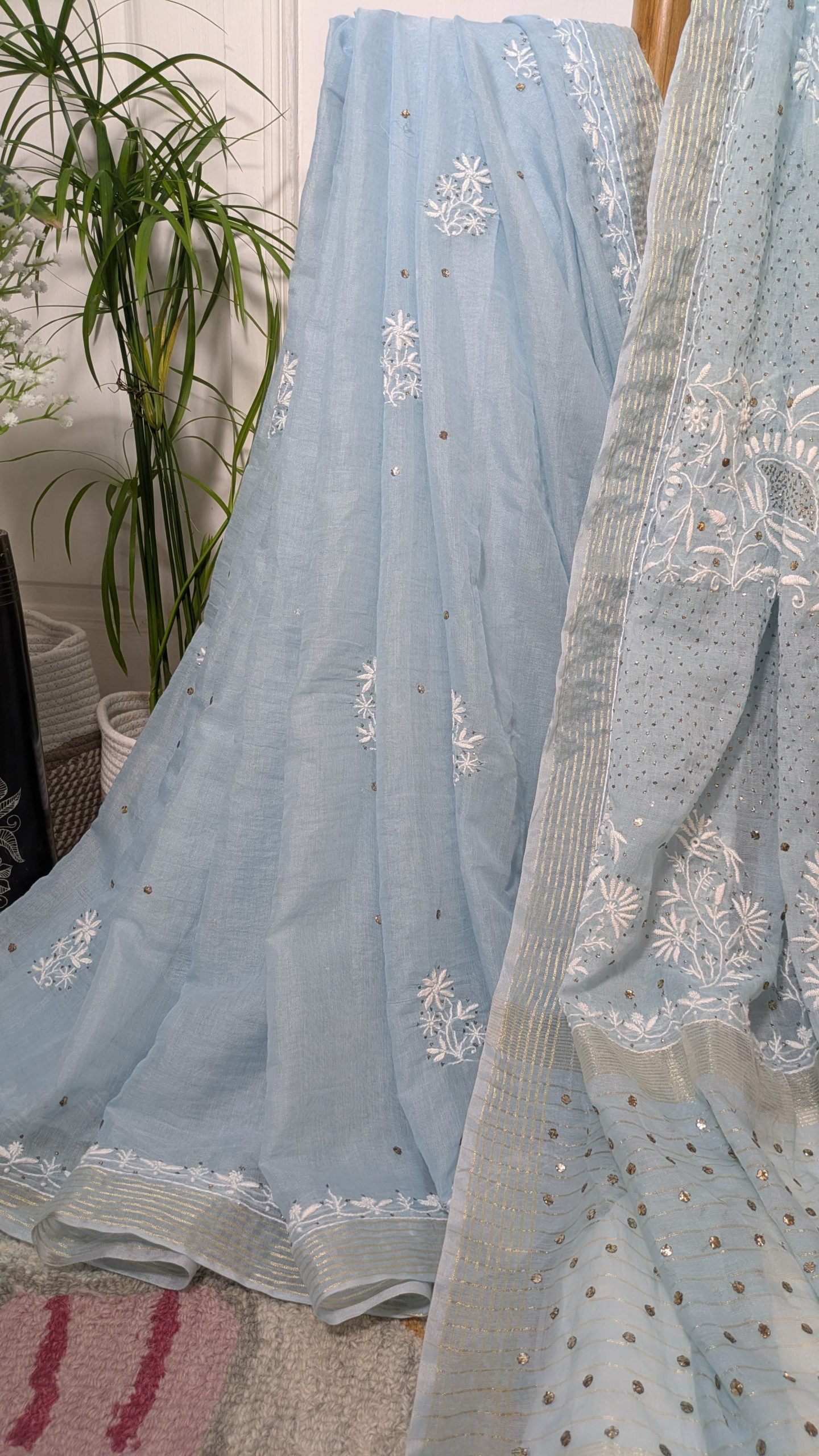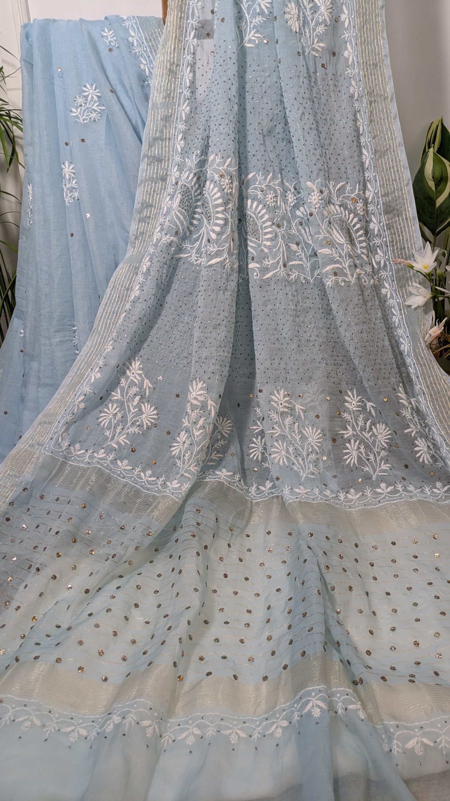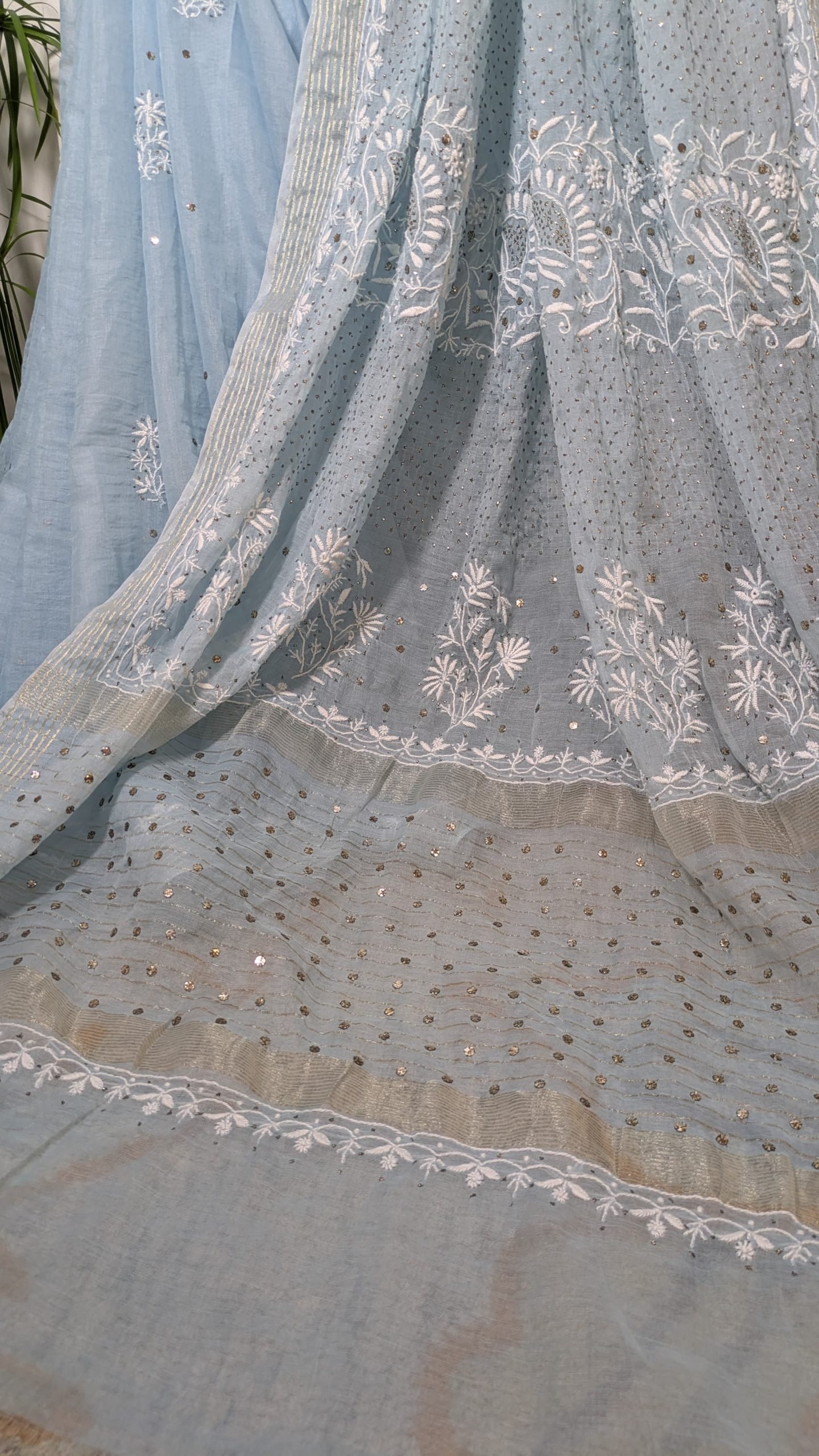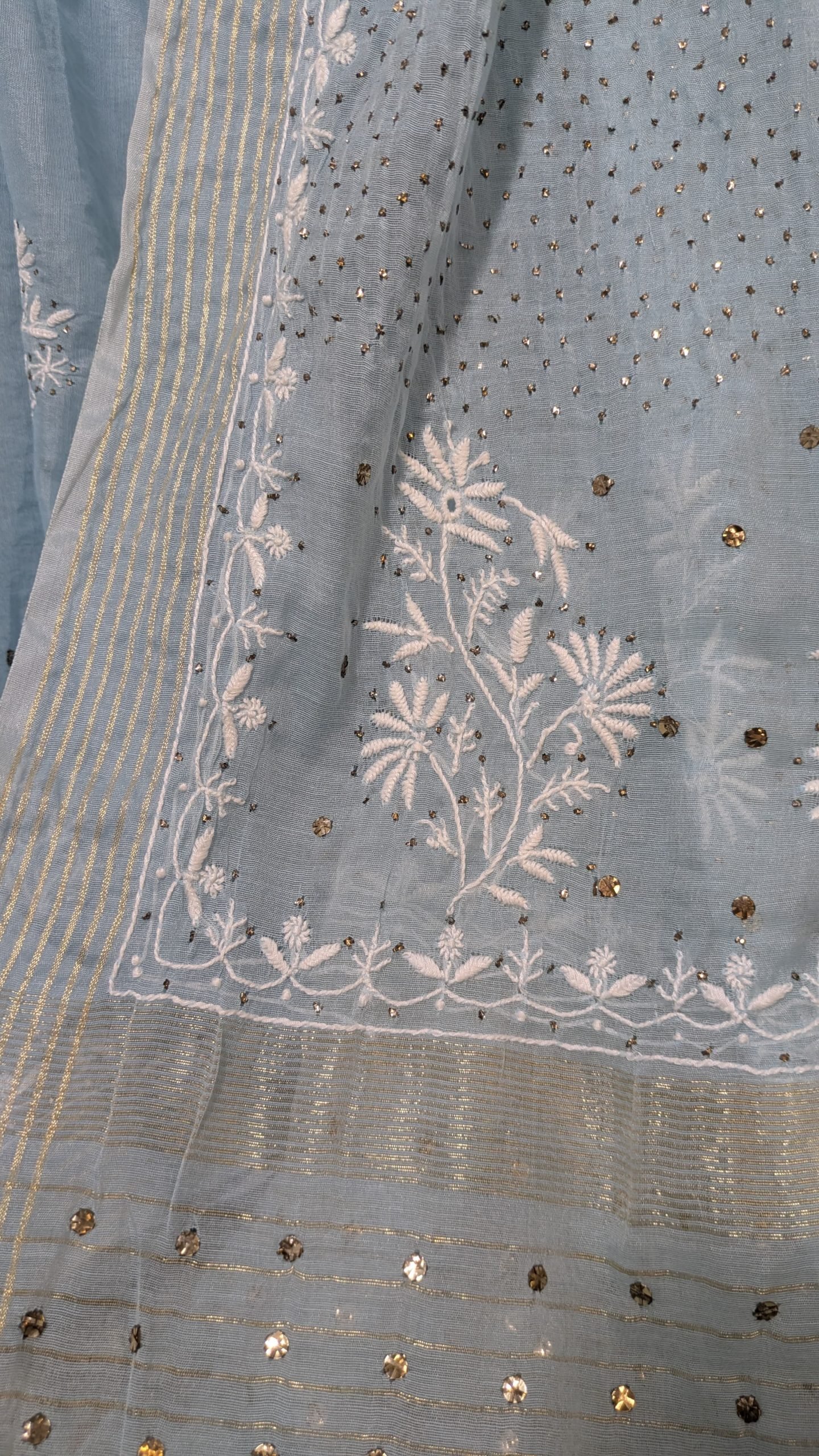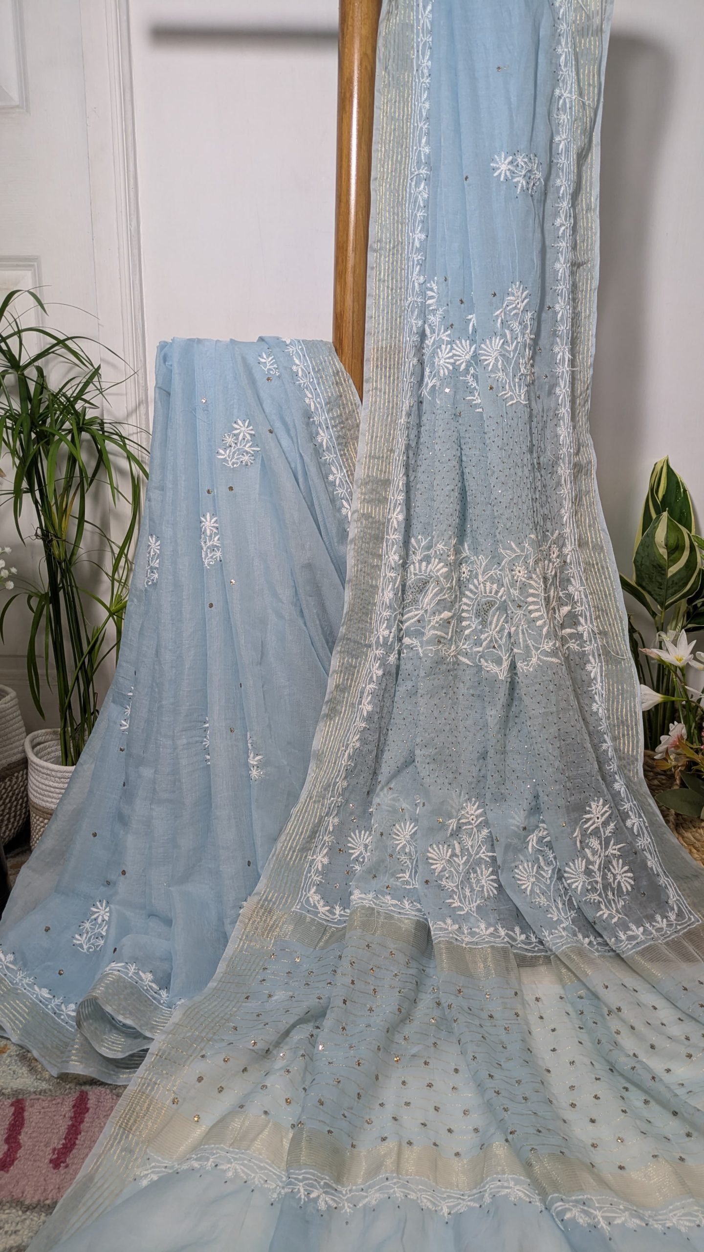 - Embellishments: Hand-embroidered Chikankari using traditional floral and jaali motifs. Accented with Mukaish work (badla), delicately hand-inlaid to create a gentle shimmer across the fabric. Embroidery in tone-on-tone white thread, keeping the look serene and understated.
