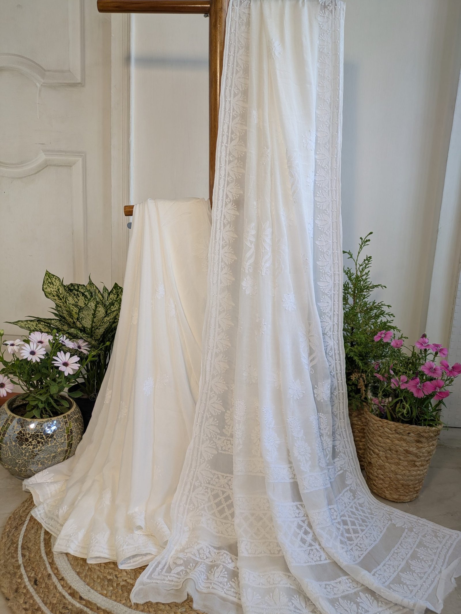 A white chikankari saree is a timeless piece of elegance , featuring intricate hand- embroidery patterns created using traditional chikankari techniques.