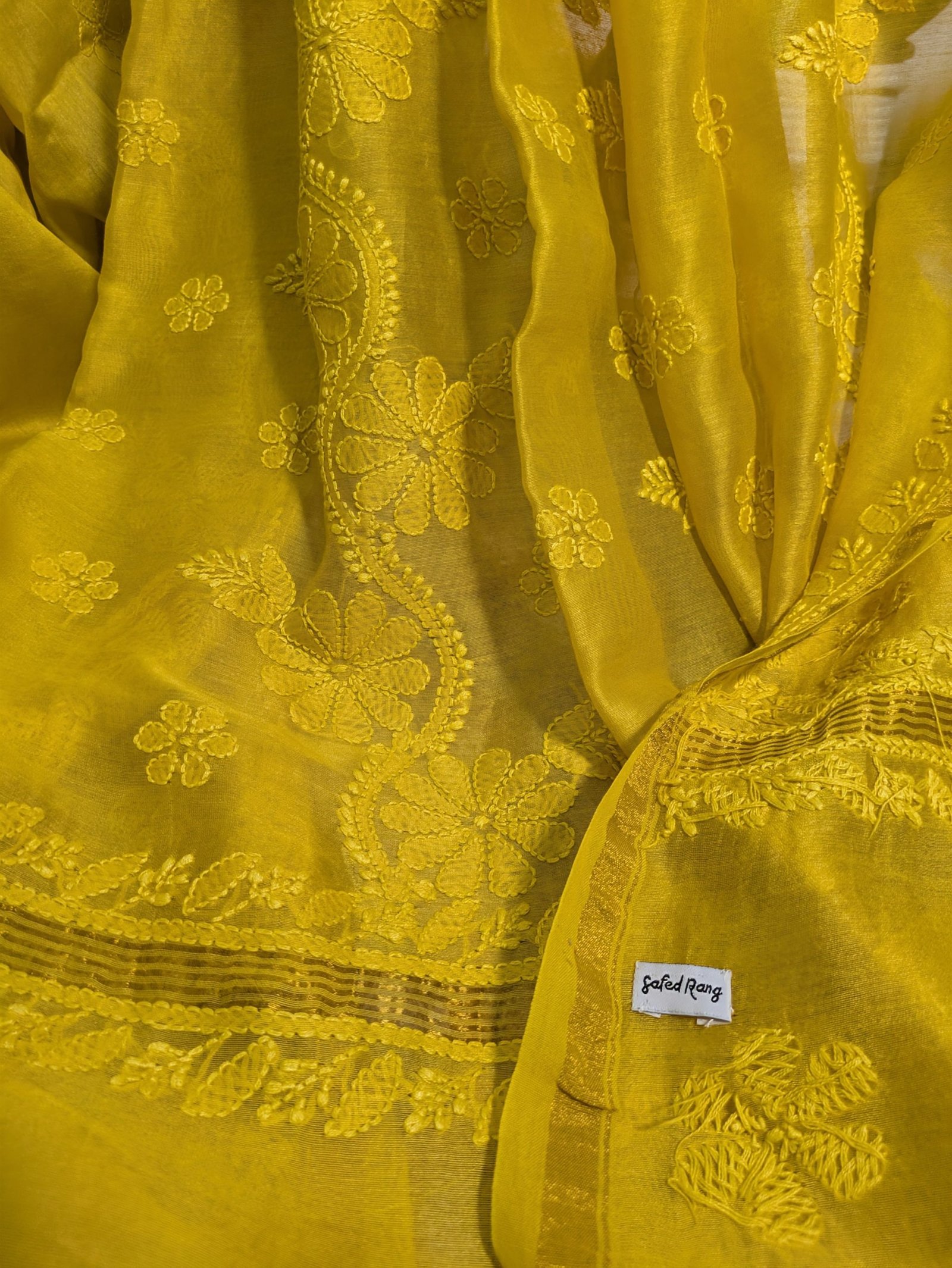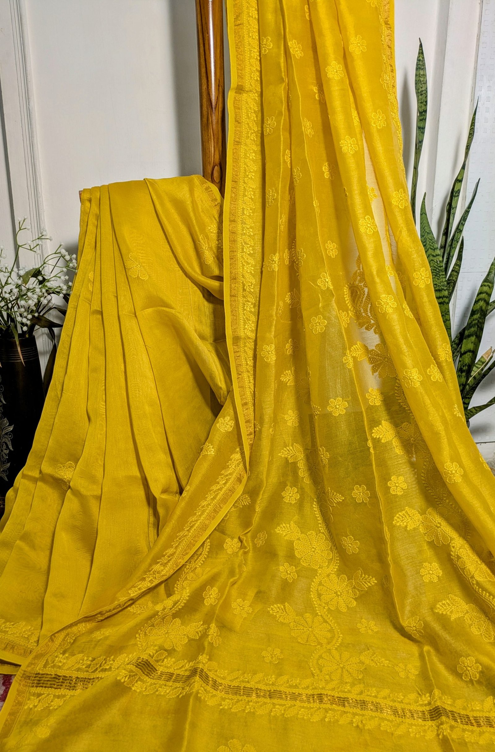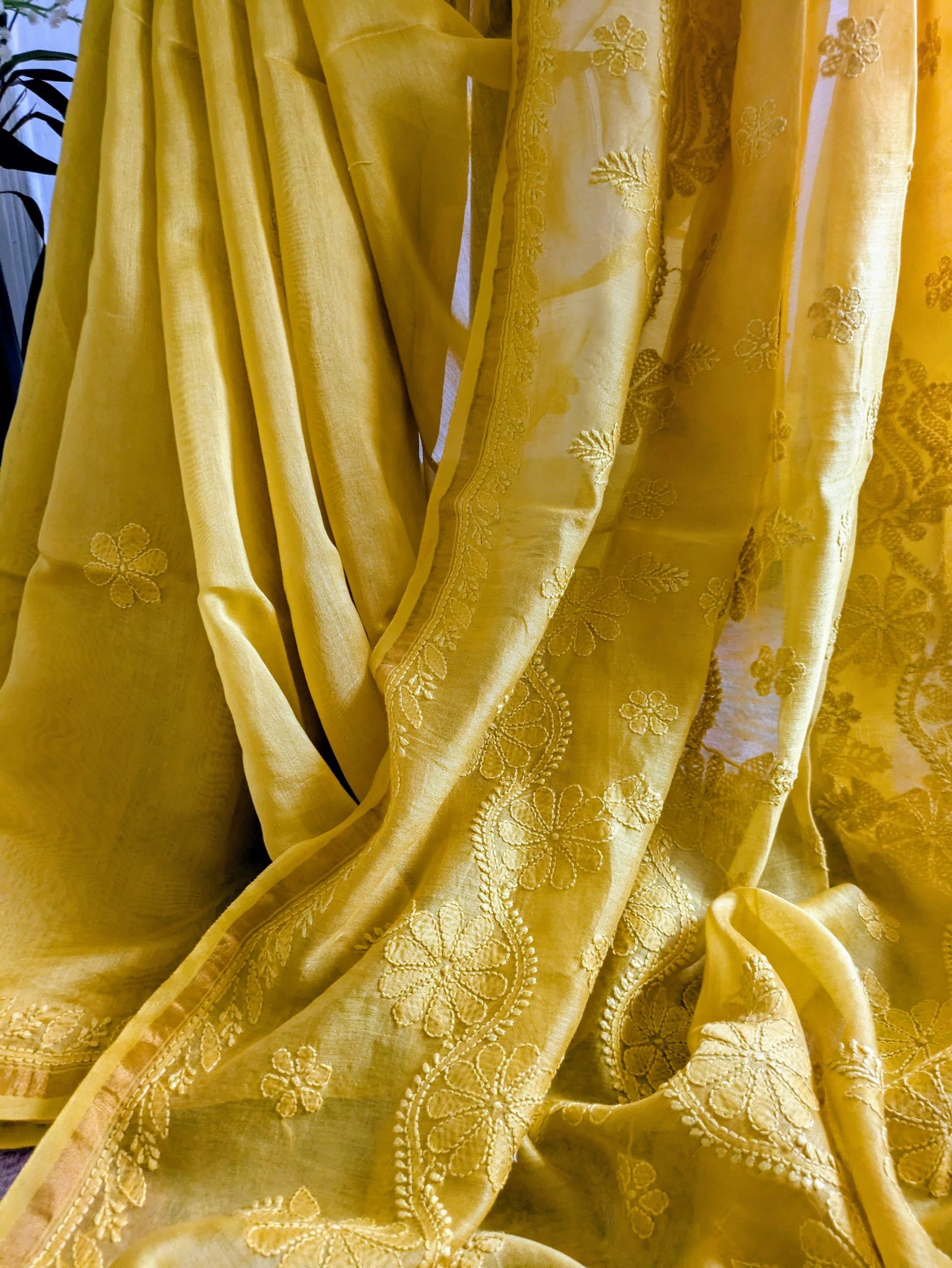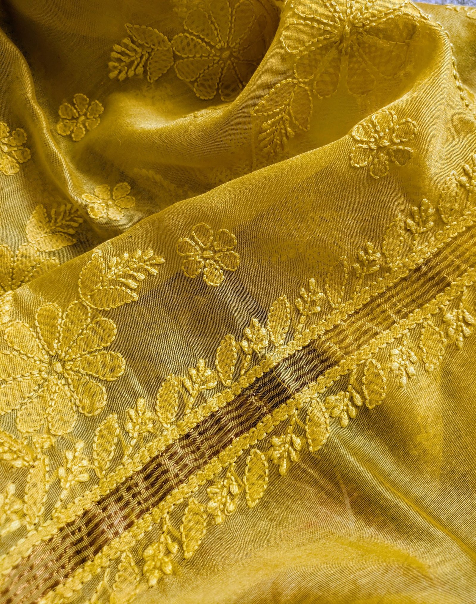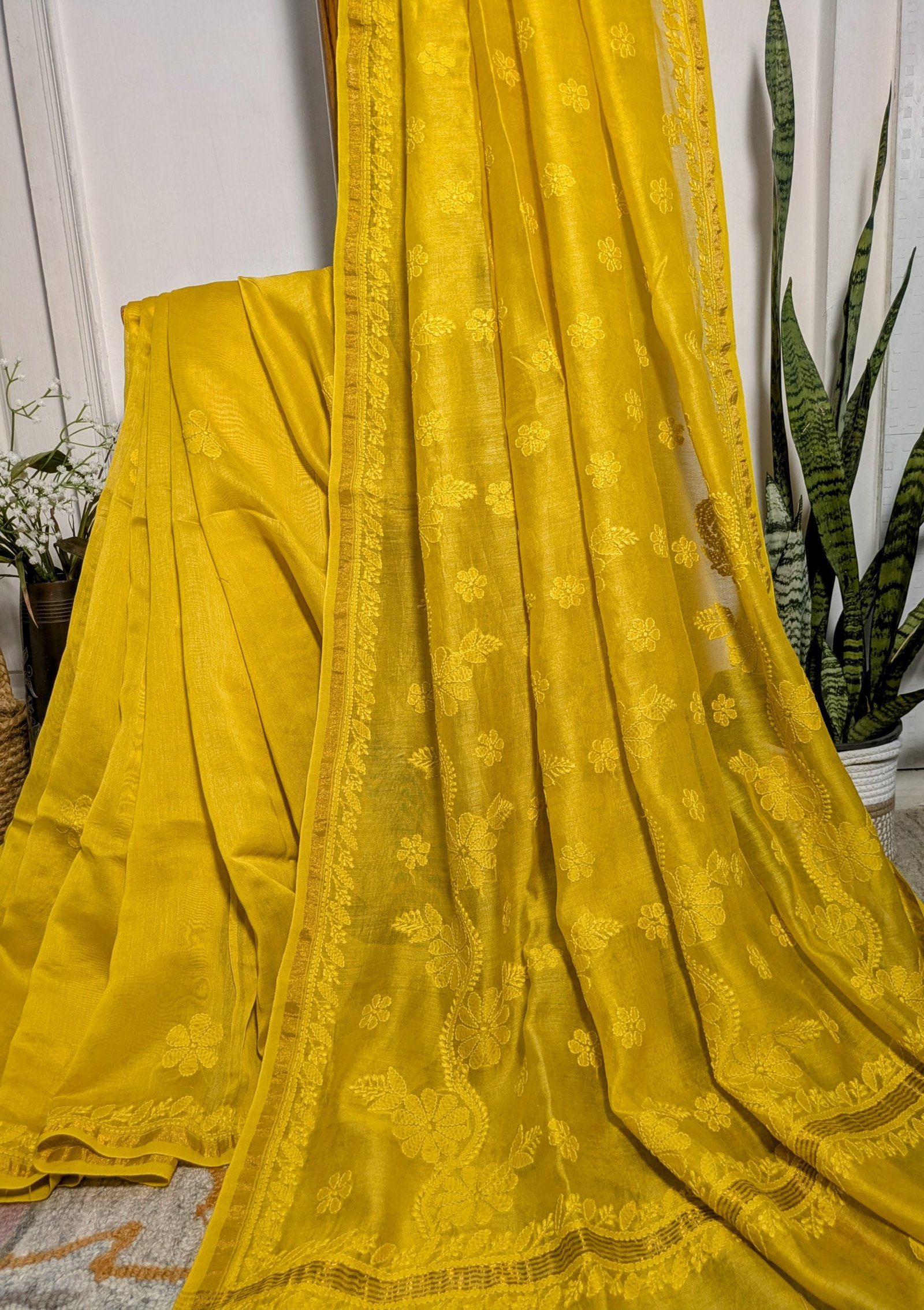 Sunahri dhup saree , haldi colored chanderi silk sare is beautifully adored with shadow chikankari work , giving it an understand elegance. 💛💛 This saree’s light sheen , along with its intricate, traditional work , makes it perfect for pre-wedding rituals, festive occasions and cultural gathering.